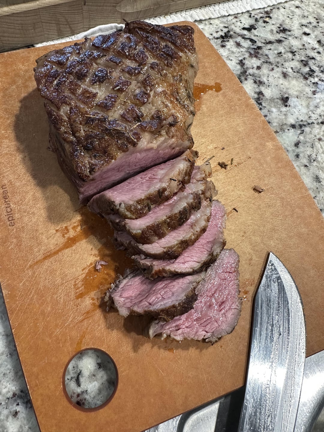2nd try…rolled with 131 for 7 hours. Was a smaller cut and had a nice fat cap. I scored it before dry brining overnight with coarse kosher salt and garlic powder. Went into the bag with rosemary, thyme and healthy sprinkling of smoke paprika. Went into the fridge for a couple of minutes after it got patted dry, gave me time to add a little oil into a ripping hot cast iron. 45 secs on the far side and 30 on the none fat side. Sliced immediately, no resting.