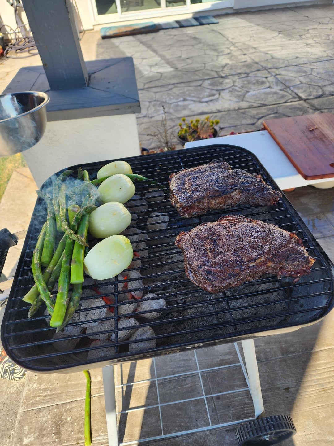 grilled some prime grade steaks from costco on my janky square grill before the game. pulled em out at 132F, came out nice and red. also paired with homemade mash, gravy and roasted veggies