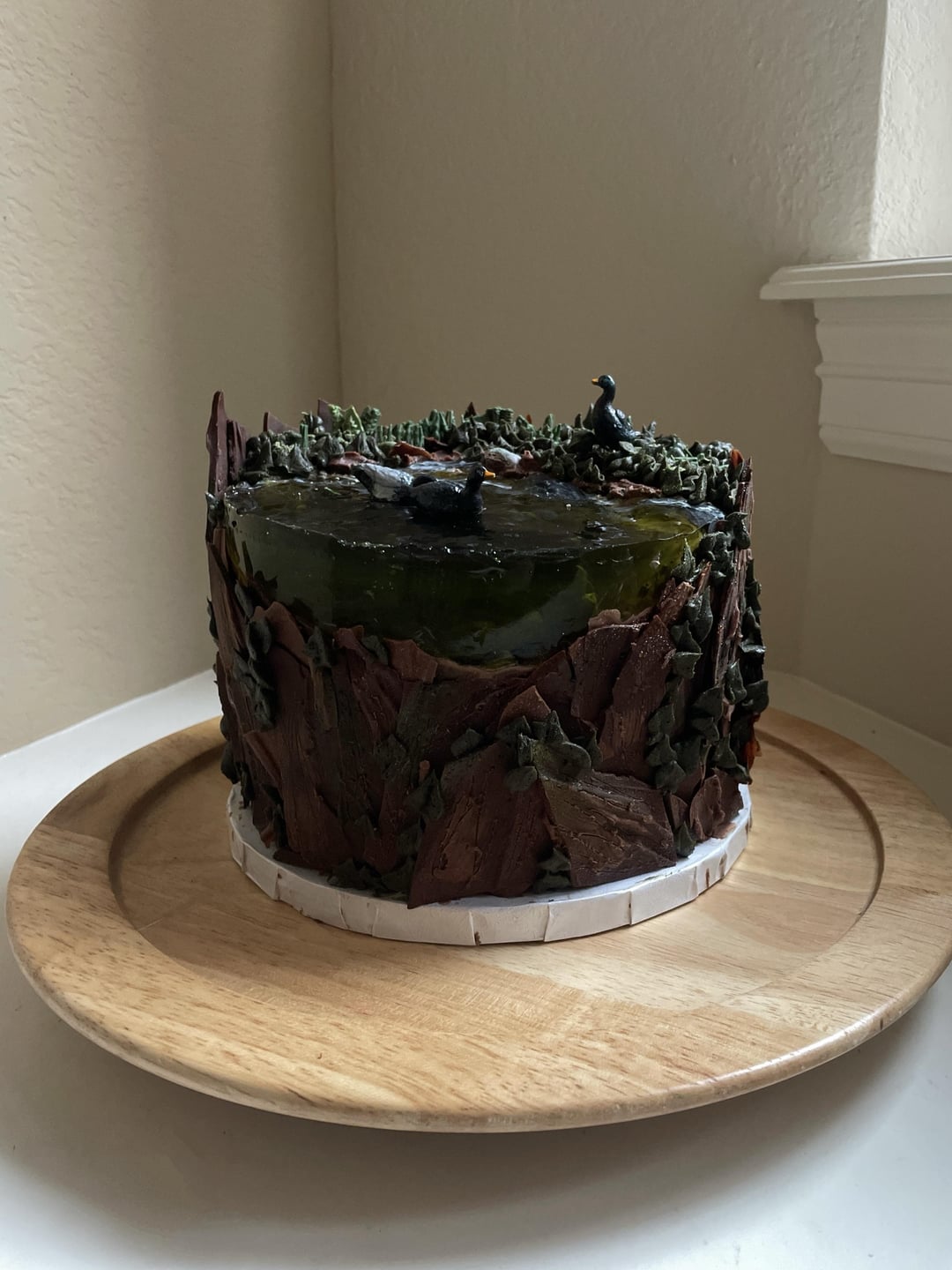He still hasn’t seen it, his birthday is tomorrow! I’m so excited for him to see it! Everything on the cake is edible except for the ducks which I could have made but couldn’t find a good mold for one on Amazon so I bought fake ones lol (this includes the turtle I’m very proud of, I’m sure he will taste delicious!)