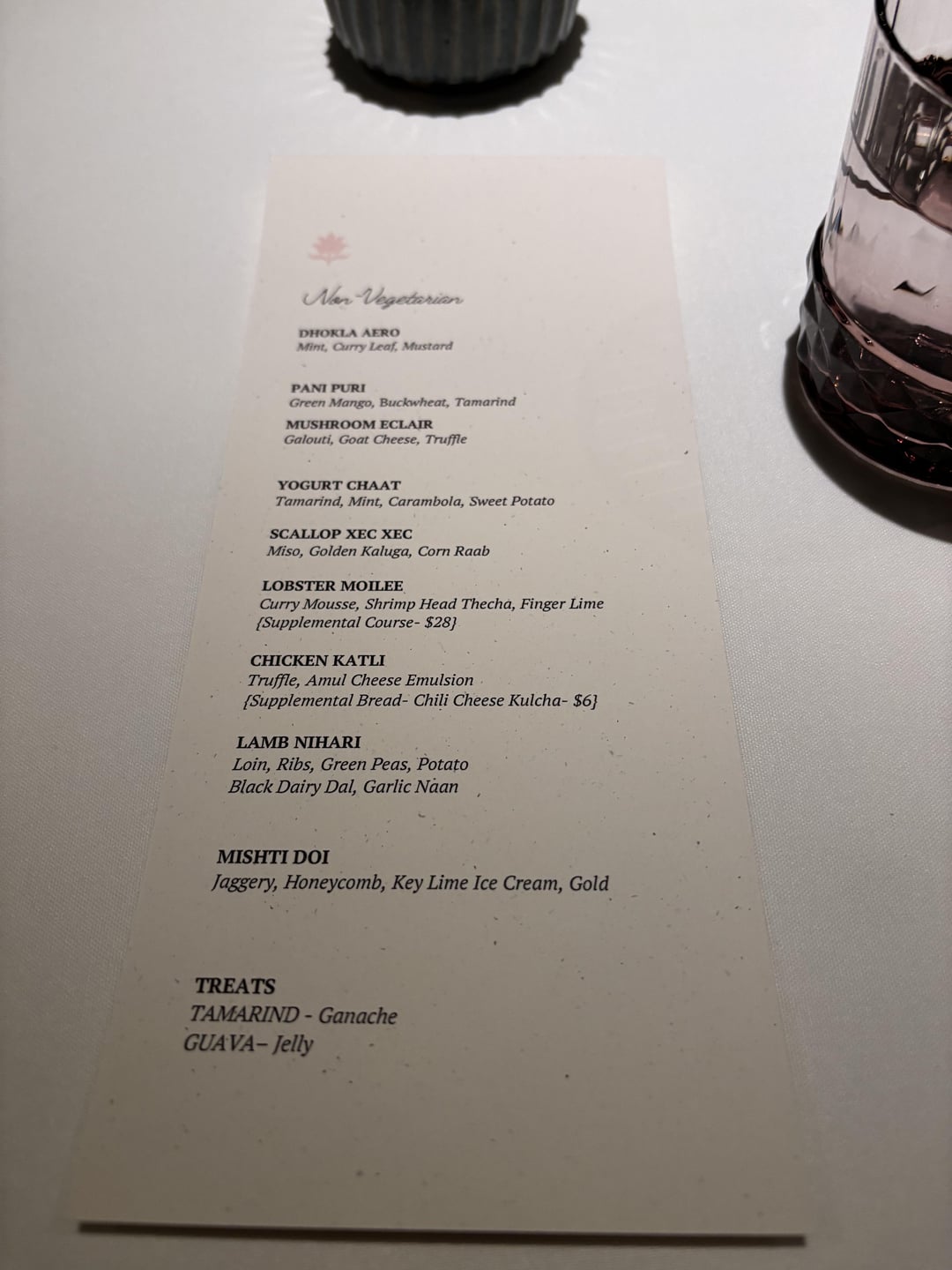 Dined solo at Indienne and was sat at a table. I opted for the non vegetarian menu. I did not opt for the lobster course as I don’t really like the taste of lobster in general.