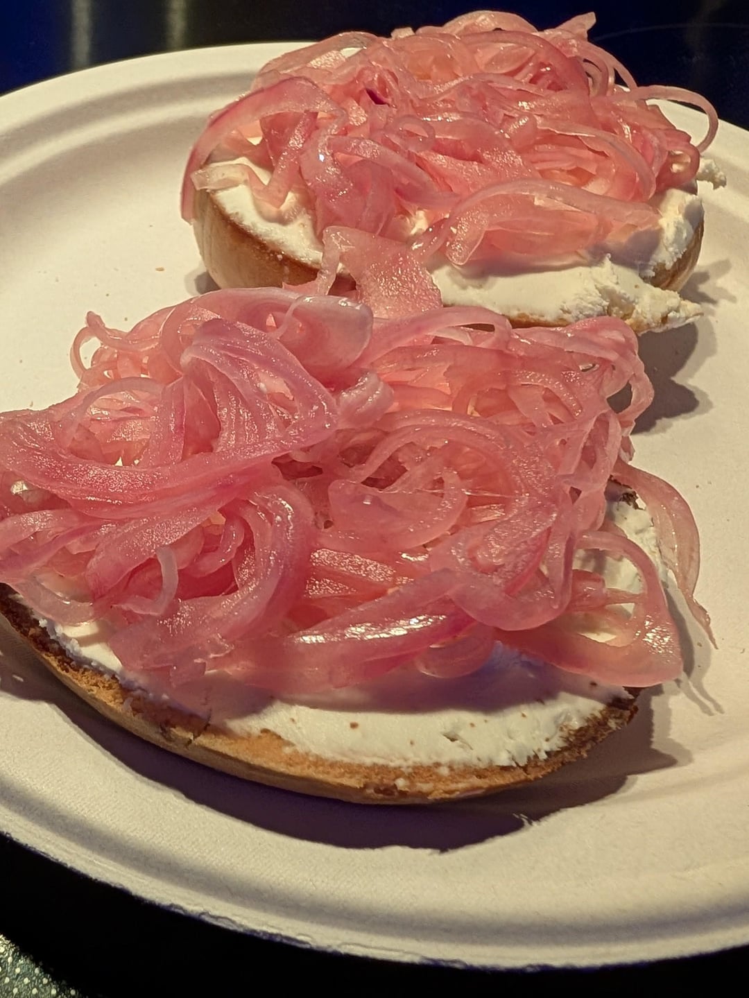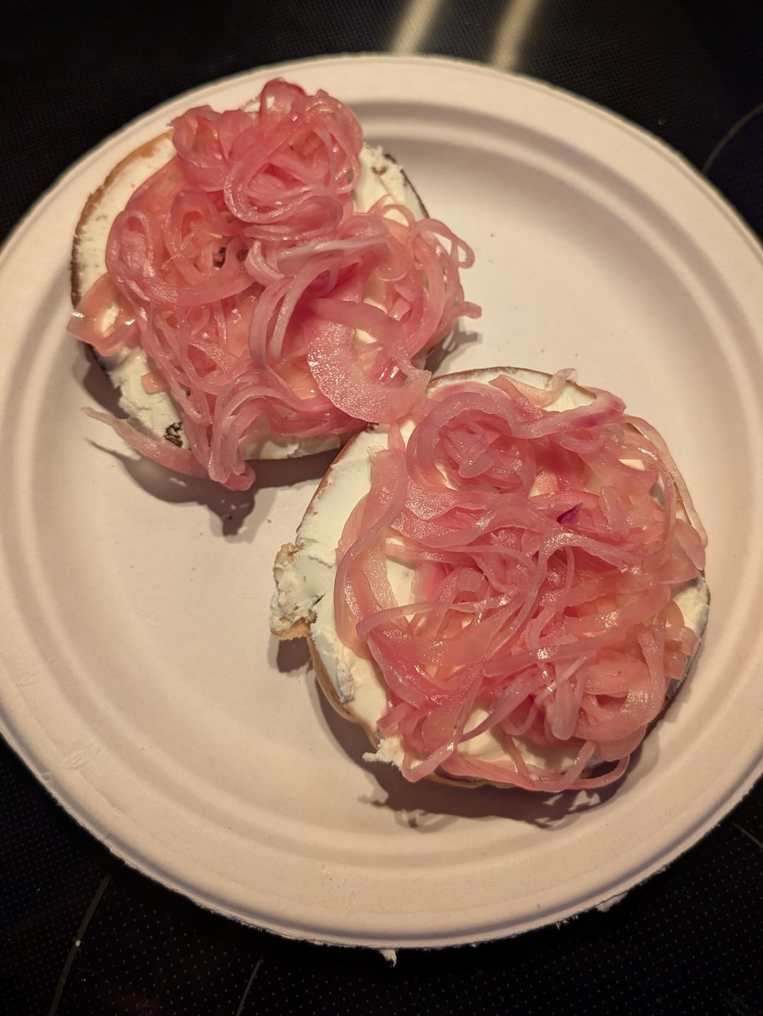 wait it’s 3am and i just had chocolate covered strawberries but omg this looks so good and we just got the good bagels and the pickled onions are ready and omg