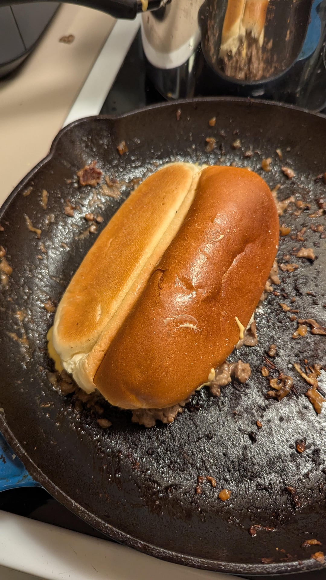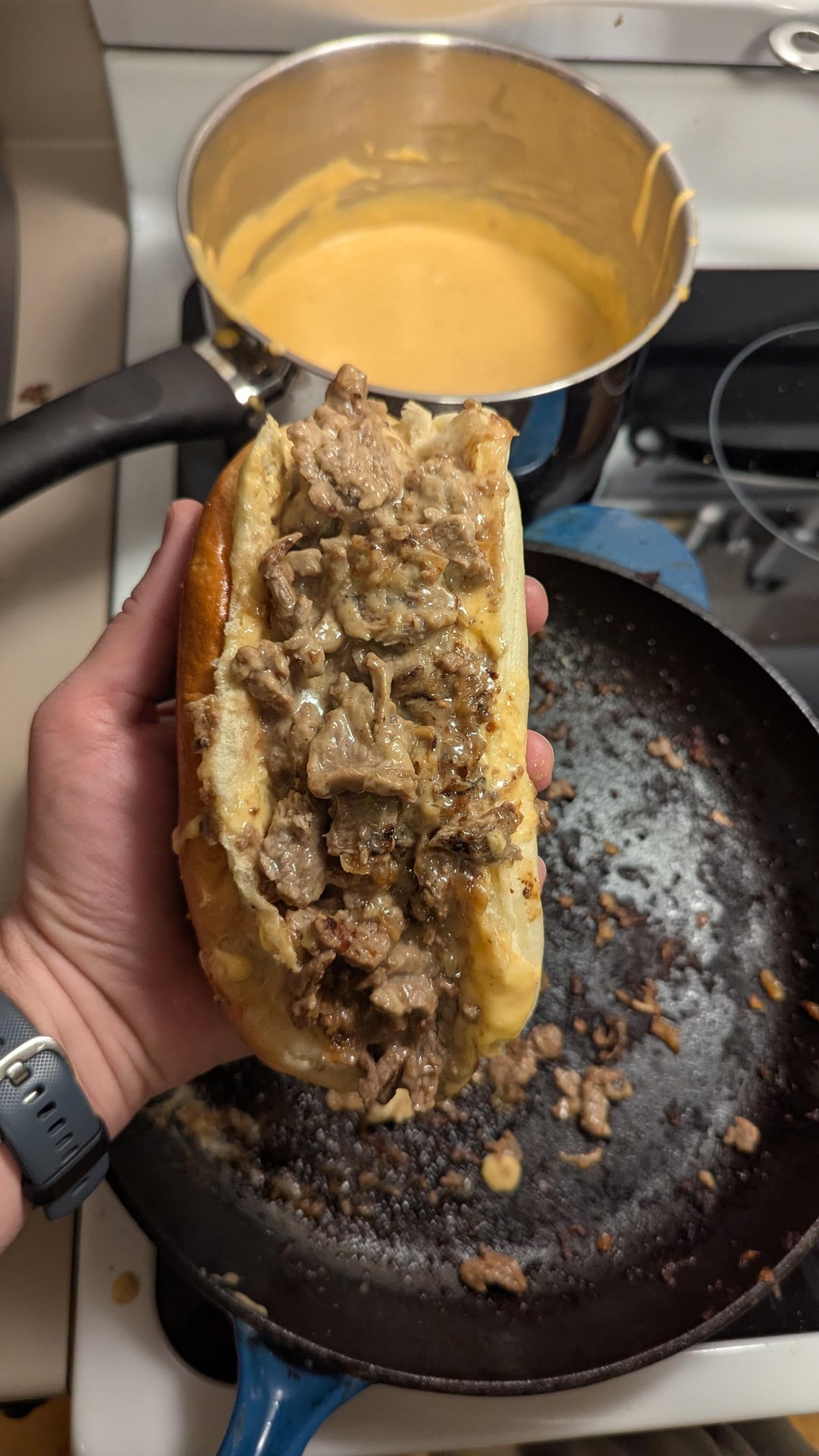 Cook was simple; Toss the beef into a hot pan to start cooking, then throw in the onions and chop it all up using a sharp metal spatula; once everything is nice and mixed and near cooked, toss some wiz+ on top, spread some wiz+ on the inside of the roll and let that rest on top; After that use a long spatula to pull off the cheesesteak slide and get everything in the roll, and boom – delicious, reasonable facsimile of a cheesesteak wiz wit to enjoy while watching the Eagles straight up pants the Chiefs on national television.