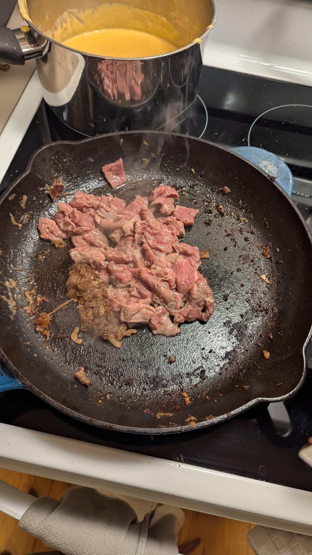 I couldn't get thin shaved ribeye (in this economy?!?!) so I grabbed some fatty-looking stewing beef, which I sliced as thin as I could and then veleveted using a cornstarch/vinegar/veg stock slurry. The beef sat for about 5 hours in the slurry before I rinsed it off as best I could. In the end the beef was nice and tender and easy to chop/chew.