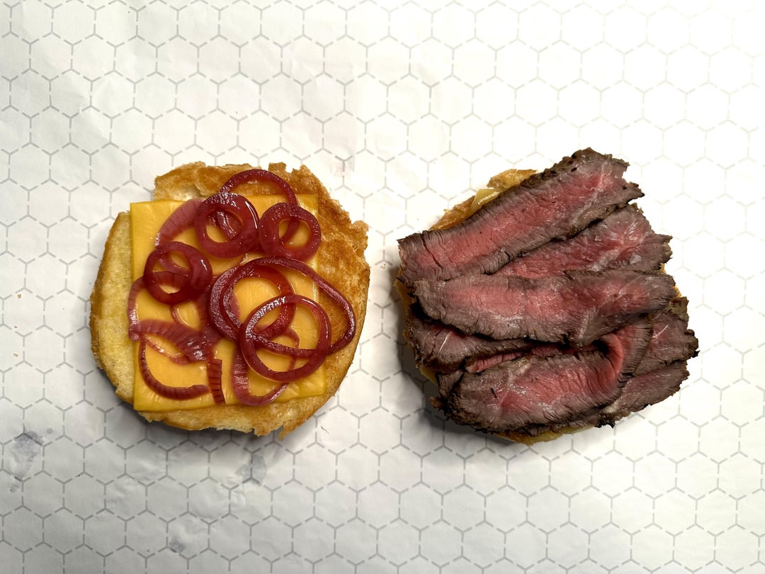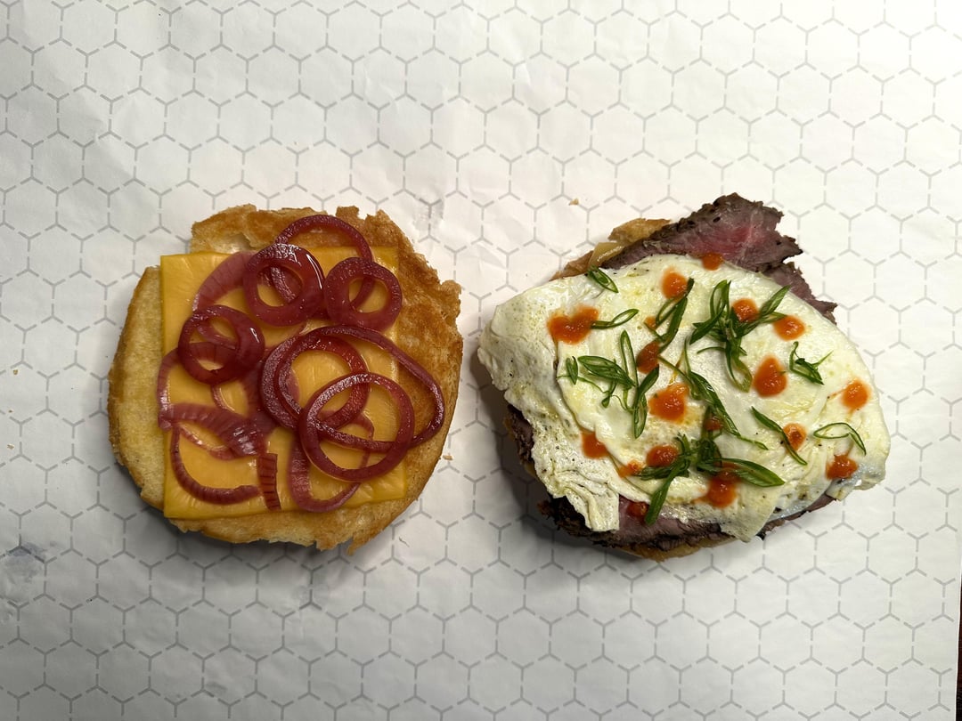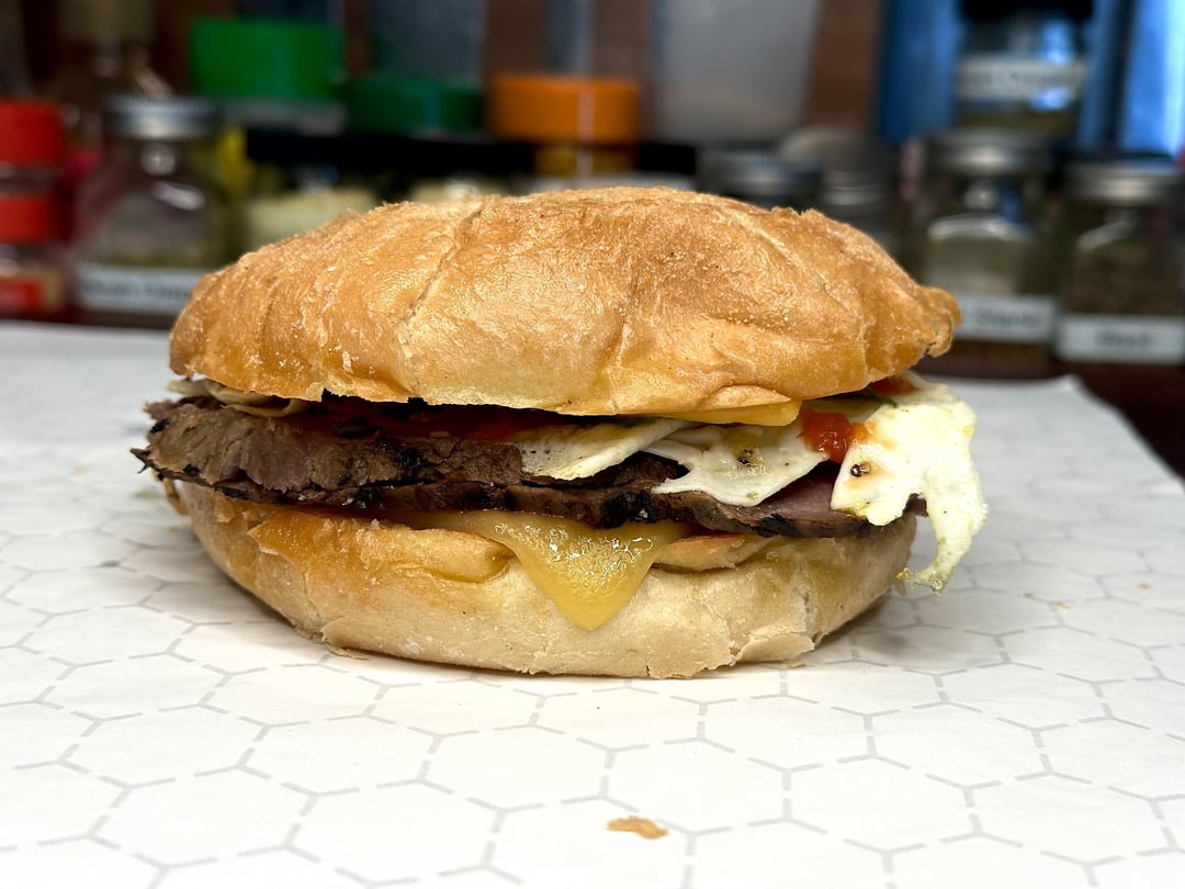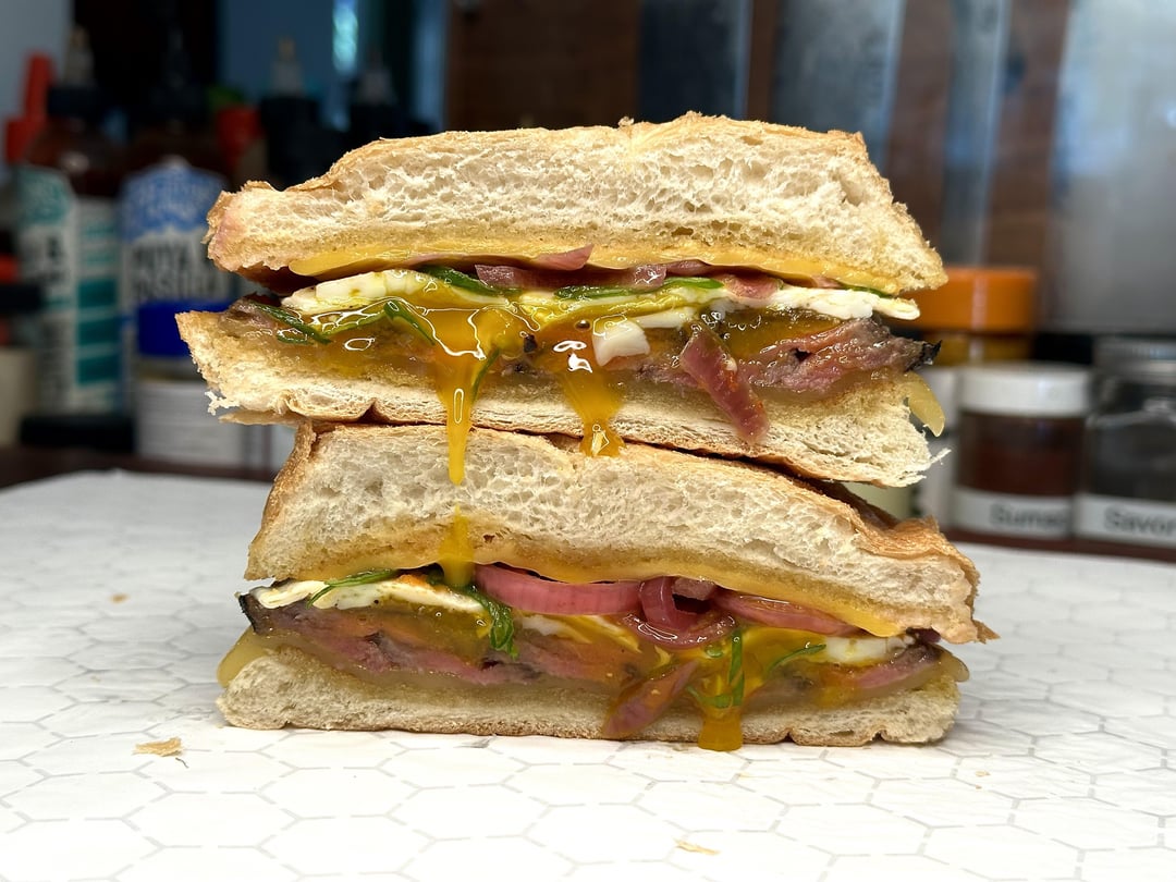 Fried egg, thin sliced leftover flat iron steak, American and smoked Gouda cheese, scallions, pickled red onions, and Marie Sharp’s Red Habanero hot sauce, on a buttered and griddled hard roll.by No_Pattern3088 1 Comment GlynnisRose 9 months ago That’s a masterpiece 👏Write A CommentYou must be logged in to post a comment.