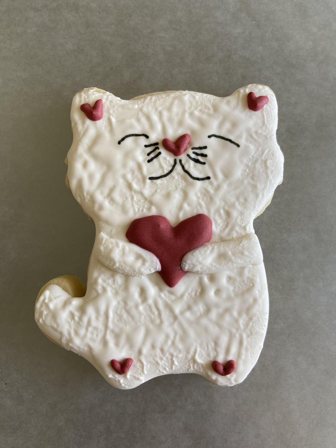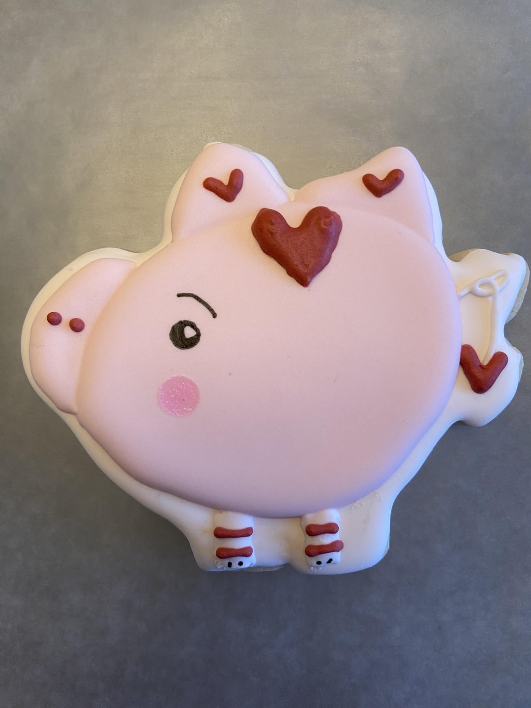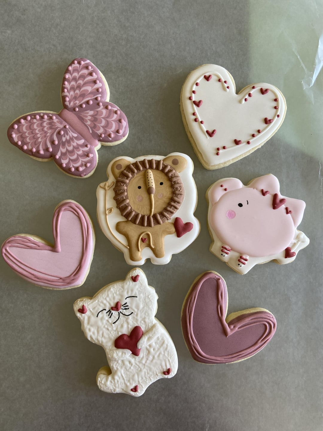 I wanted to practice, try a few new techniques, and attempt a more challenging design. The set feels a little random, but was fun to do. The lion was my more challenging design. I don’t have a projector. I have also been focusing on achieving specific colors. I wanted to do the red heart accents as transfers, but had trouble getting the desired red. So due to time constraints, I did those free hand. I purchased the lion and pig cookie cutters from cutmycookies on Etsy. I copied the website design for those. The cat, white heart, and butterfly were inspired by Instagram posts, but don’t remember whose now.