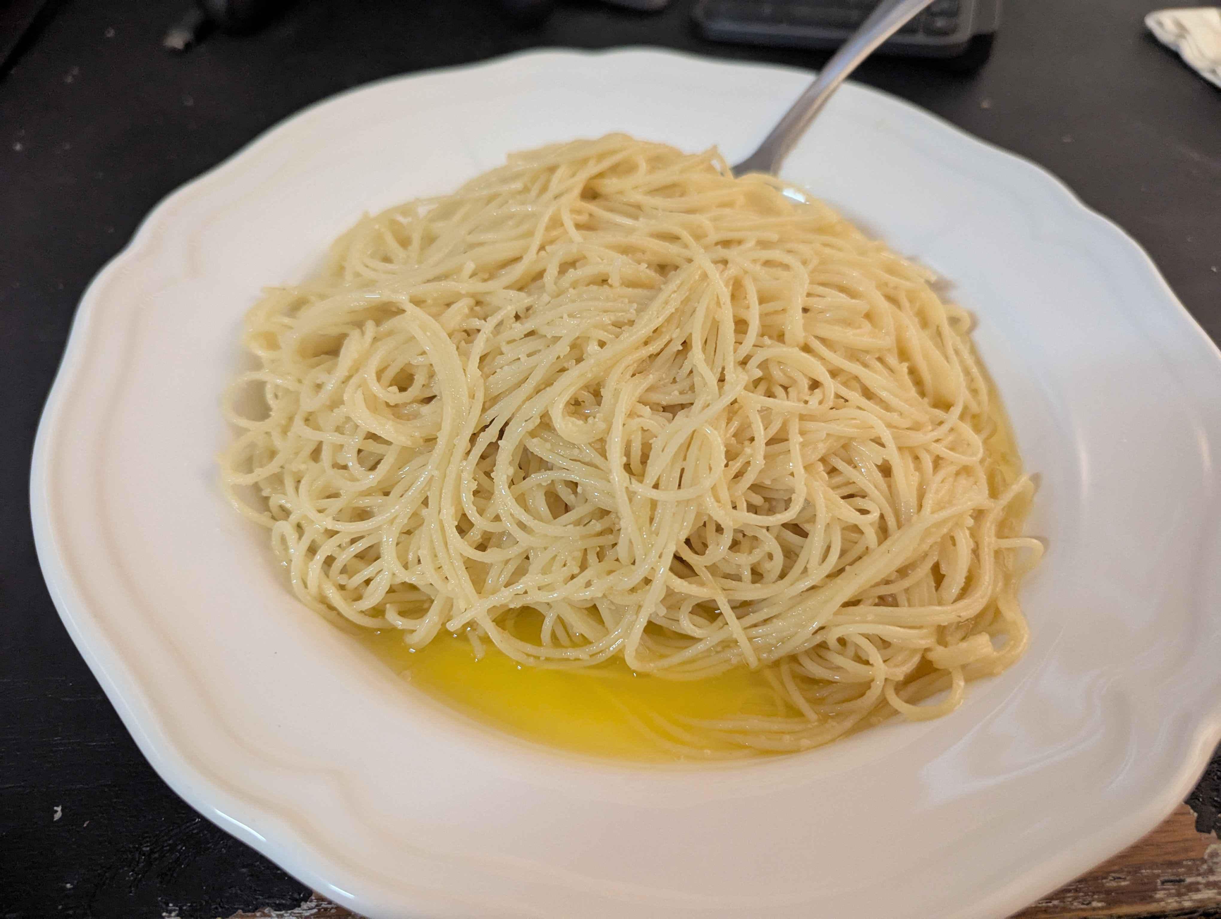 Aggressive-Nebula-78 8 months ago Half a box of angel hair pastaHalf a stick of unsalted sweet cream butterHalf a stick of irish butterLastly a sprinkling of garlic salt and some unlabled mystery shaker parmesean that was in the cabinetMy friends are flaming the hell out of me for this one, what do y’all think? Gotta do what I can with what I’ve got.