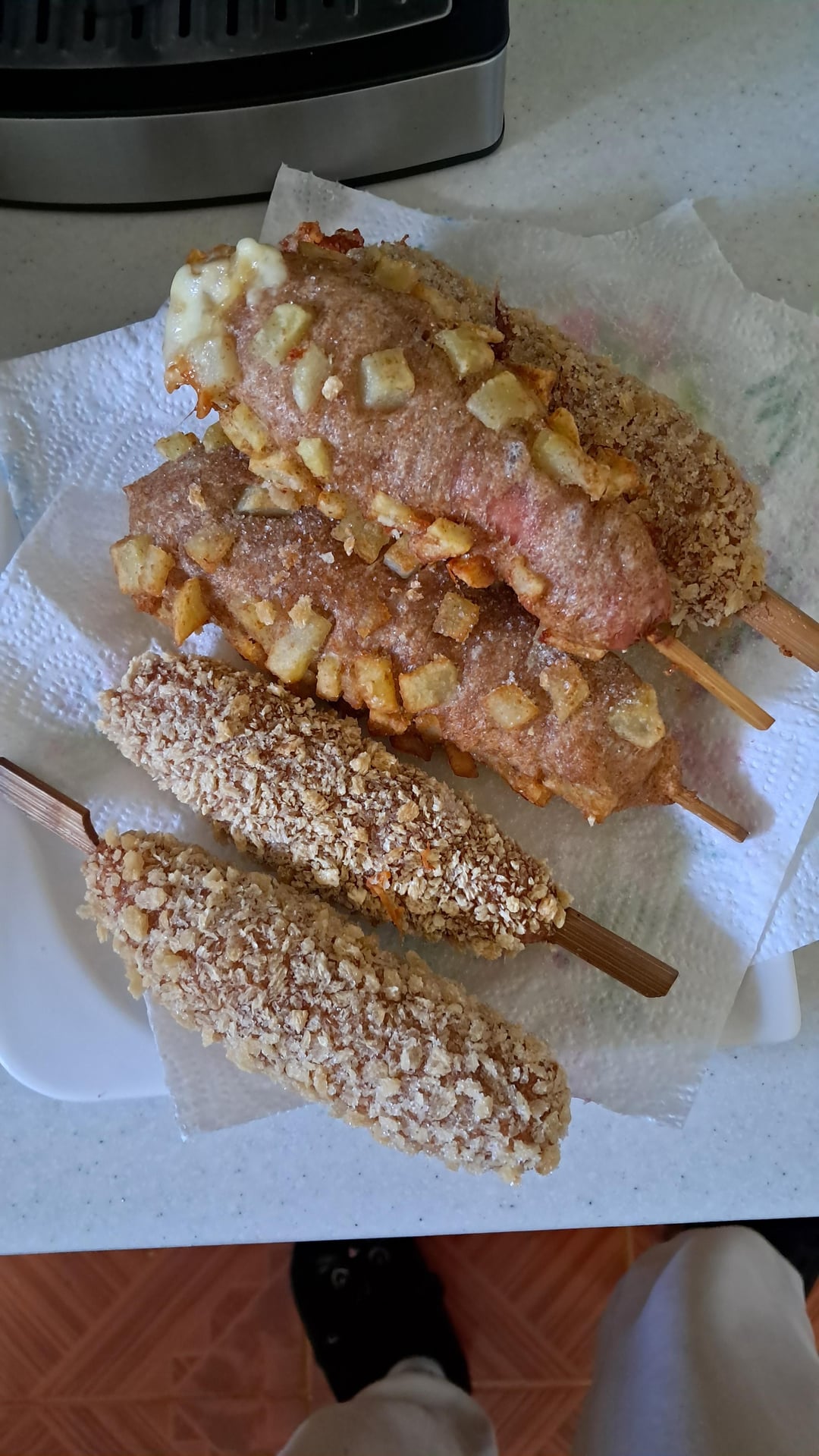 Instead of sugar I used stevia. The batter is just yeast,whole wheat flour, salt ,stevia, water. The hotdogs inside are around 58 calories each. Idk the calories for the cheese,I threw away the packaging.Panko crumbs 335 calories per 100g. Deep fried.