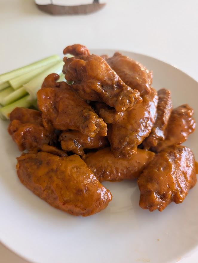 24 hour salt * baking powder dry brine in the fridge, fried for 12 minutes, first saucing, fried for another two minutes, second saucing. Sauce was butter, franks, black and red pepper, and corn starch slurried in lemon juice for consistency and zest. The crunch was incredible, the flavor was deep, and the meat was tender and juicy.