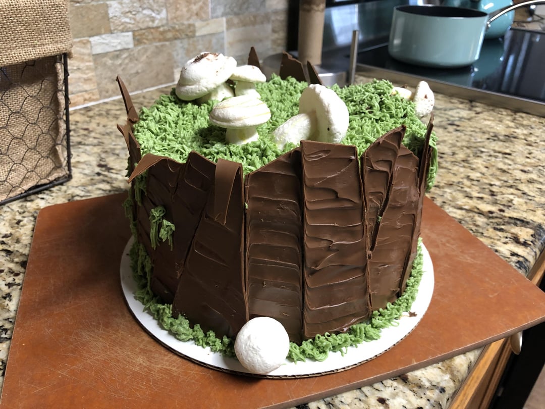 My daughter wants a stump cake for her birthday. We are trying to decide which type of bark to use (chocolate pieces or frosting), and which kind of moss to make (cake or crumbled biscuits), and what kind of mushrooms to make (meringue or marzipan). In your experience with this, what would you do and not do again and which mushrooms did you make? I think these look like meringue ones – which look fantastic by the way. Great job!