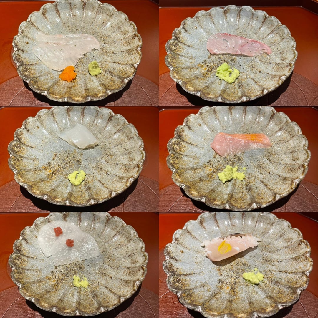 Sashimi 5 kinds: grouper, sea bream, alphosino, squid, Spanish mackerel. All procured from Shizuoka and aged between 5-10 days plus daikon strips for palate cleanser. Served piece by piece Ala omakase.
