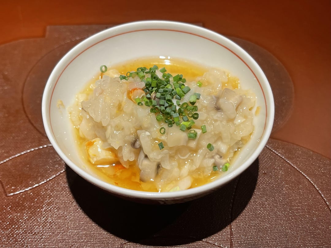 Ojiya (rice porridge) made with lobster broth and topped with various seafood cuts. Thicker than congee but less dense than risotto, a bit bland.