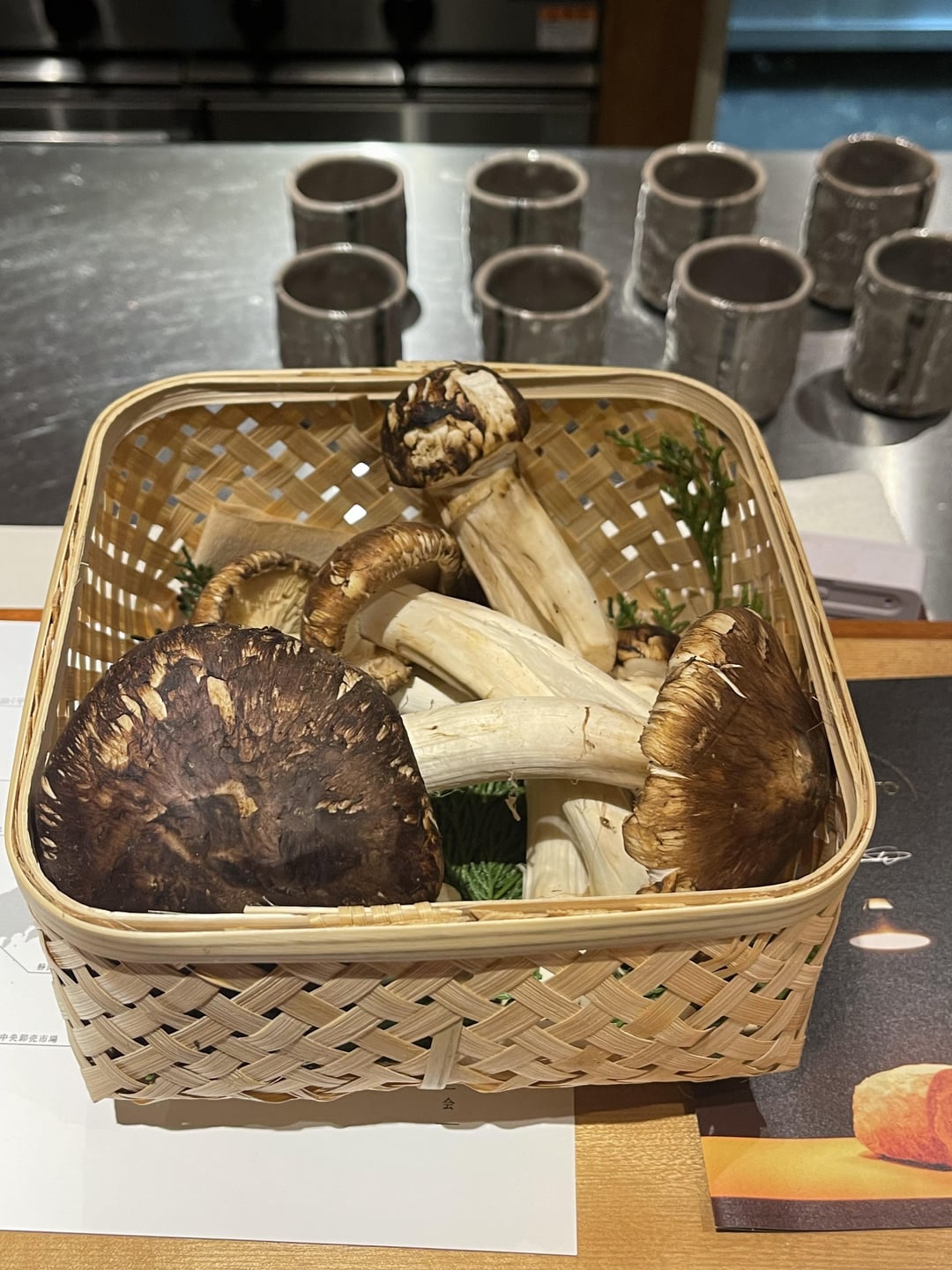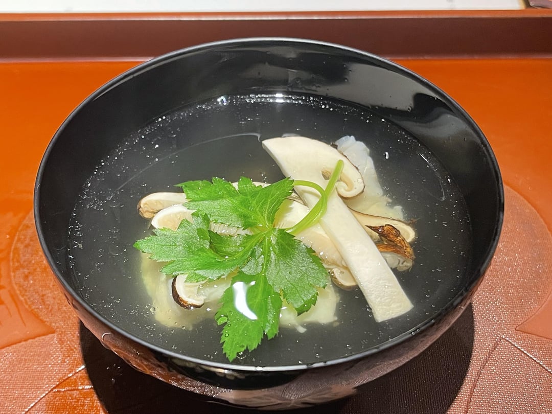 Long tooth grouper & Matsutake mushrooms in dashi made with kelp that has been aged for 6 years in Fukui and local spring water with hardness of 7 mg/L.