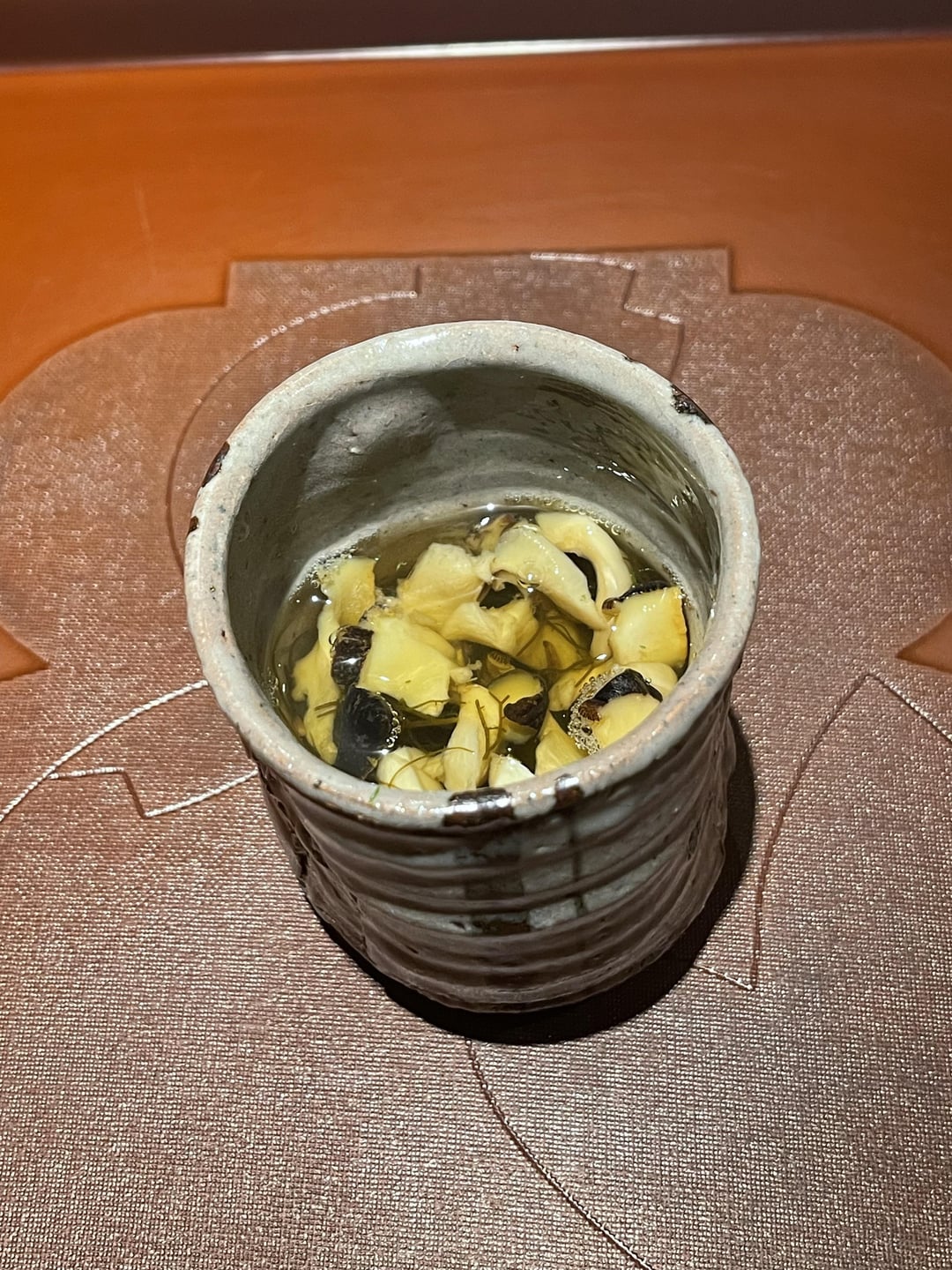 Turban shell from Hiroshima & rock seaweed with dashi made from a blend of Hokkaido kombu, 2-year aged bonito and local spring water with hardness level of 20 mg/L.