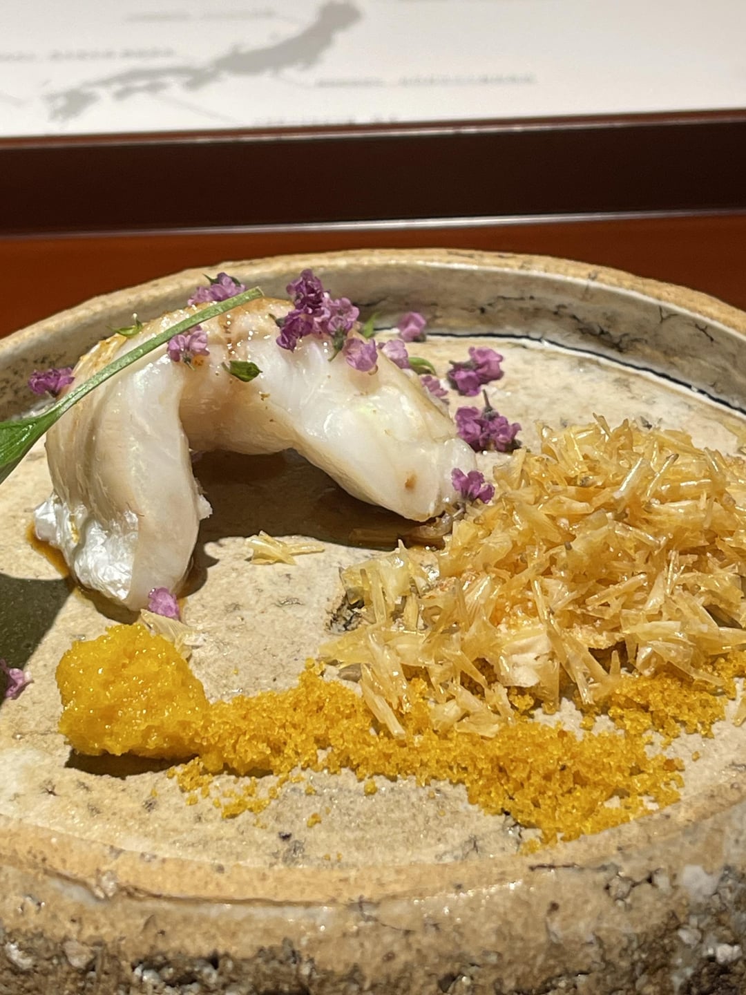 White tilefish (shirakawa) from Ehime cooked matsukasa-yaki style (crispy scale) and served with sea urchin. The fish had its scales removed and fried separately for the shattering crunch.