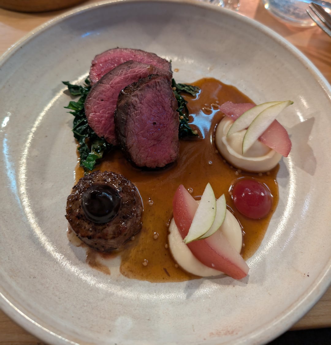 Rich and intense. Lovely venison, rich sauce lifted by the pear