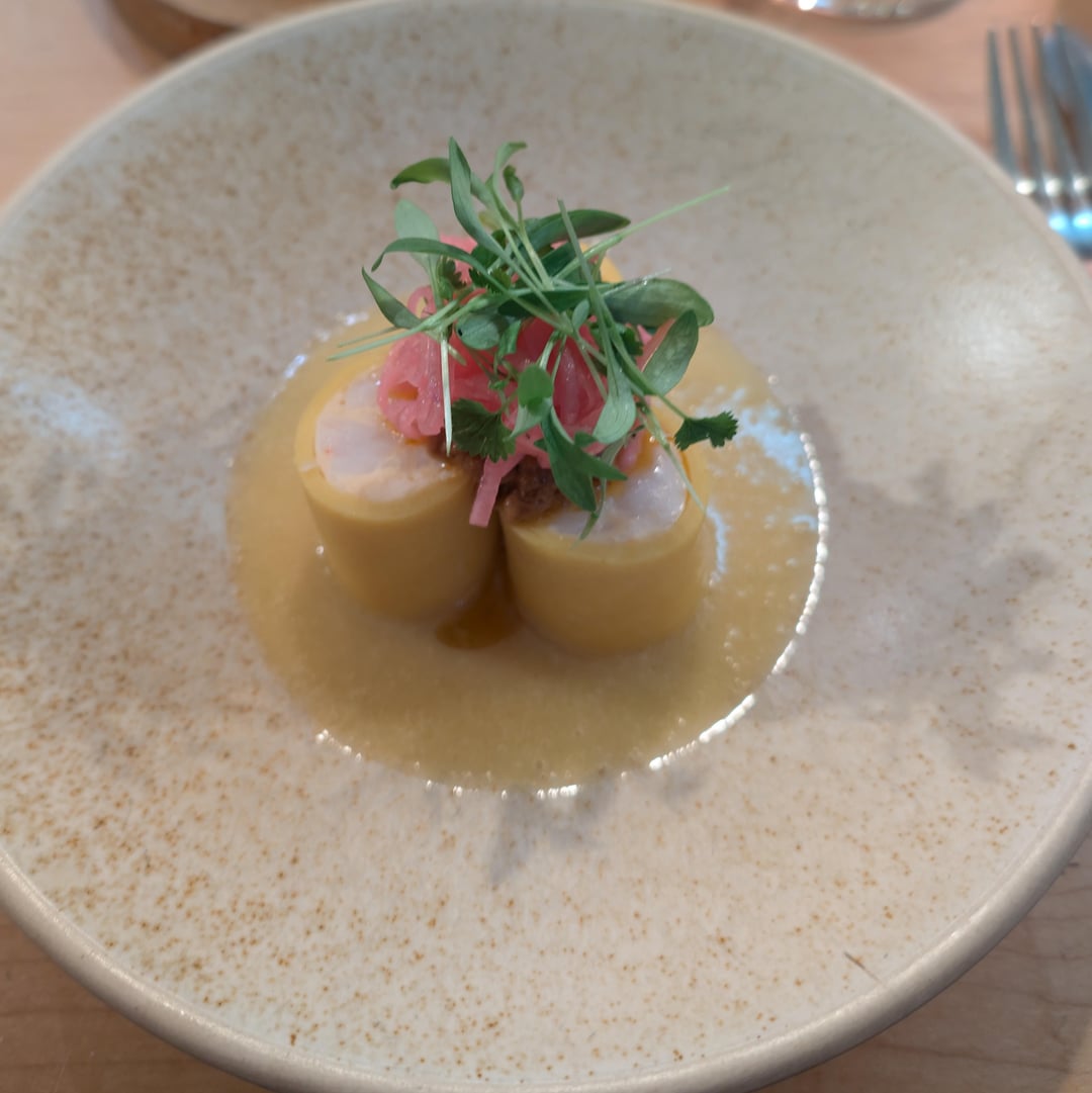 The star dish. A prawn mousse, with chunks of beautifully cooked prawns. Wrapped in perfectly cooked pastry, with an intense scallop XO. Served with a beure blanc sauce