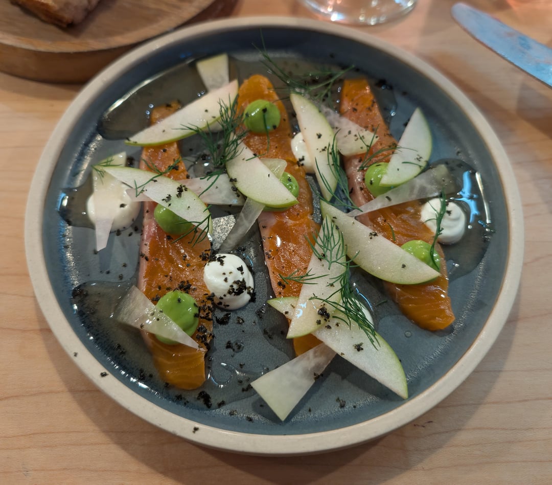 Another light dish, lovely slightly cured trout. Hits of heat and sweetness from the wasabi and the apple