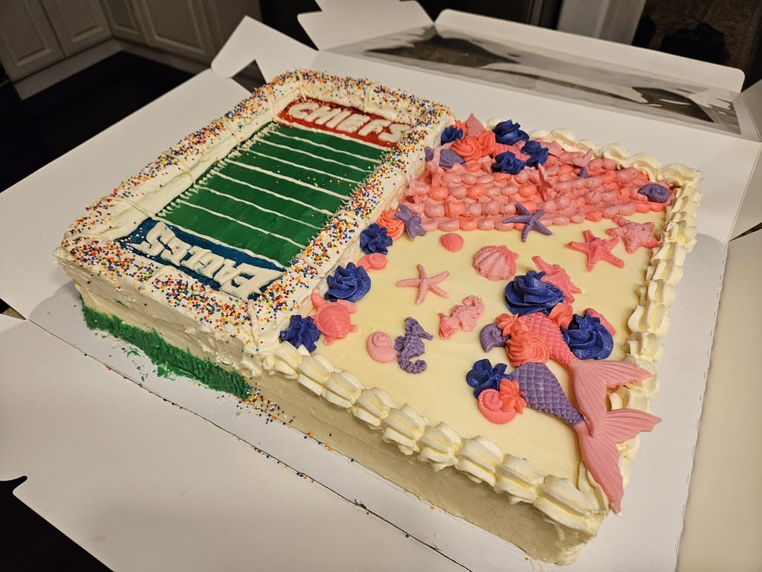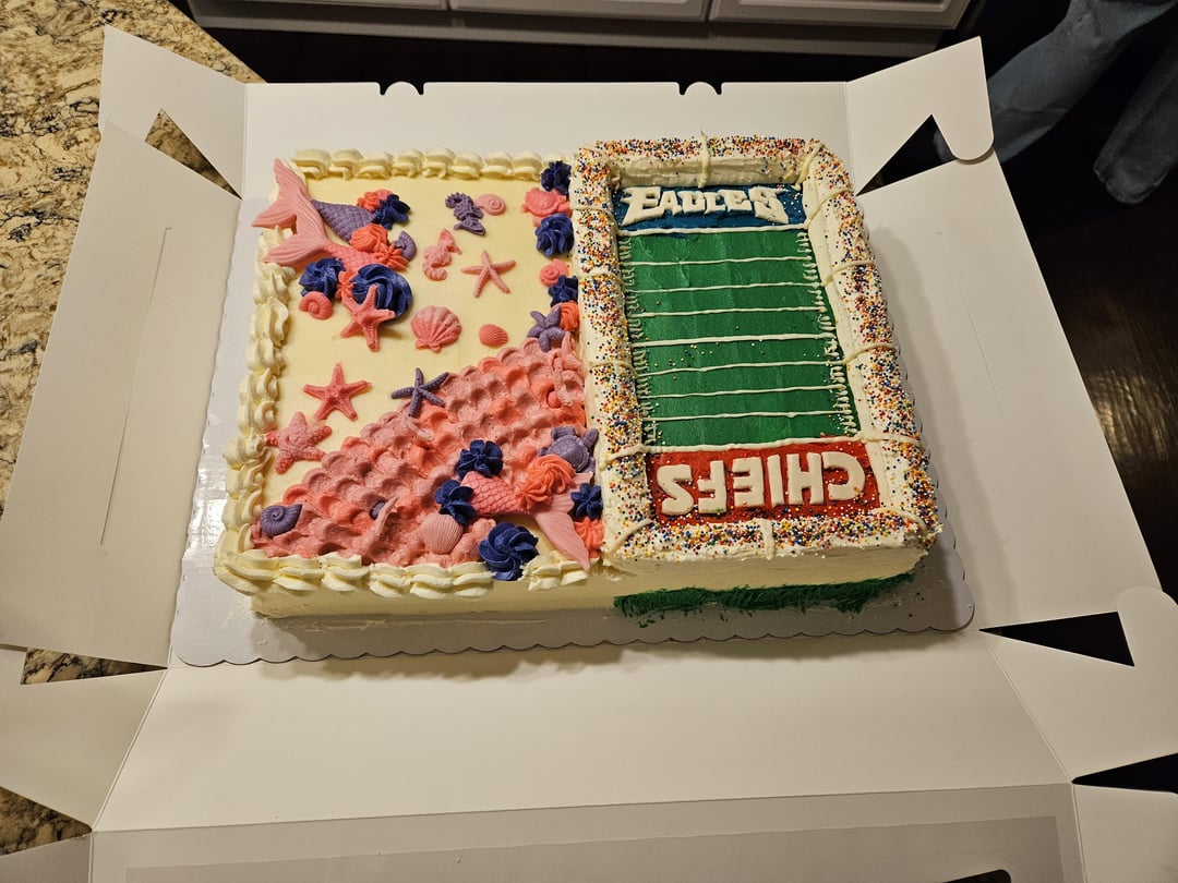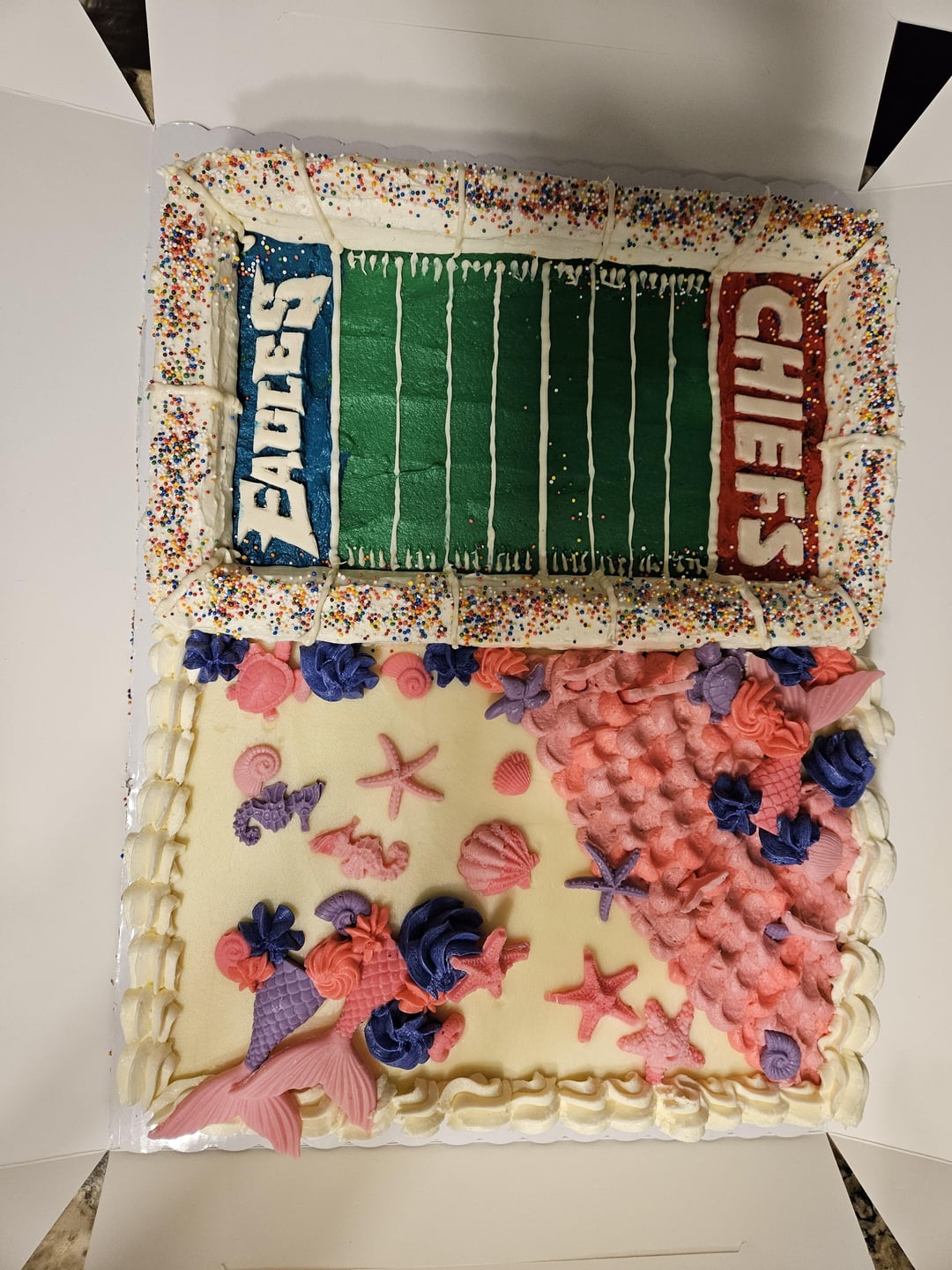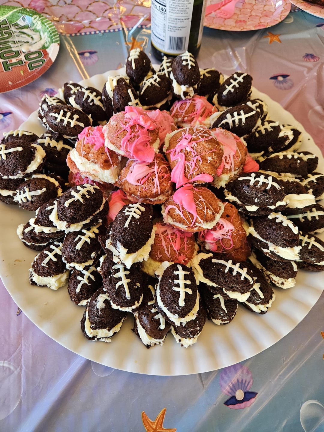 The cake is vanilla with a vanilla custard filling and ermine frosting. In addition to the sheet cake, I made mini cakes in the shape of footballs and clam shells using Madeline onas tahgi sliced and filled with frosting like little whoopie pies. Those were where the little ones provided the most artistic help 😁. The football whoopie pies are just chocolate cake with ermine frosting (delicious combo). And the clam shells are strawberry cake with cream cheese frosting (also great combo).