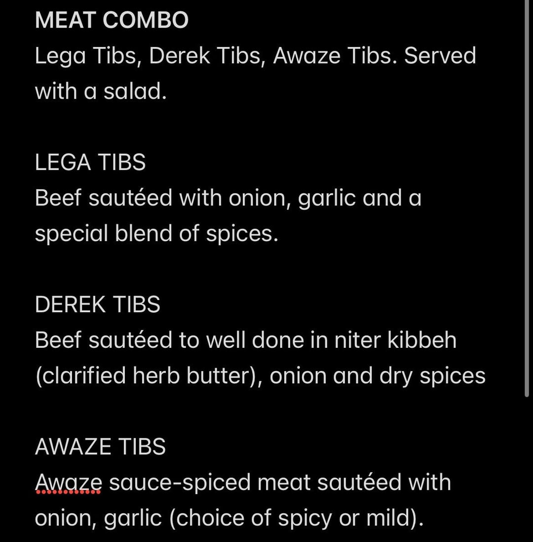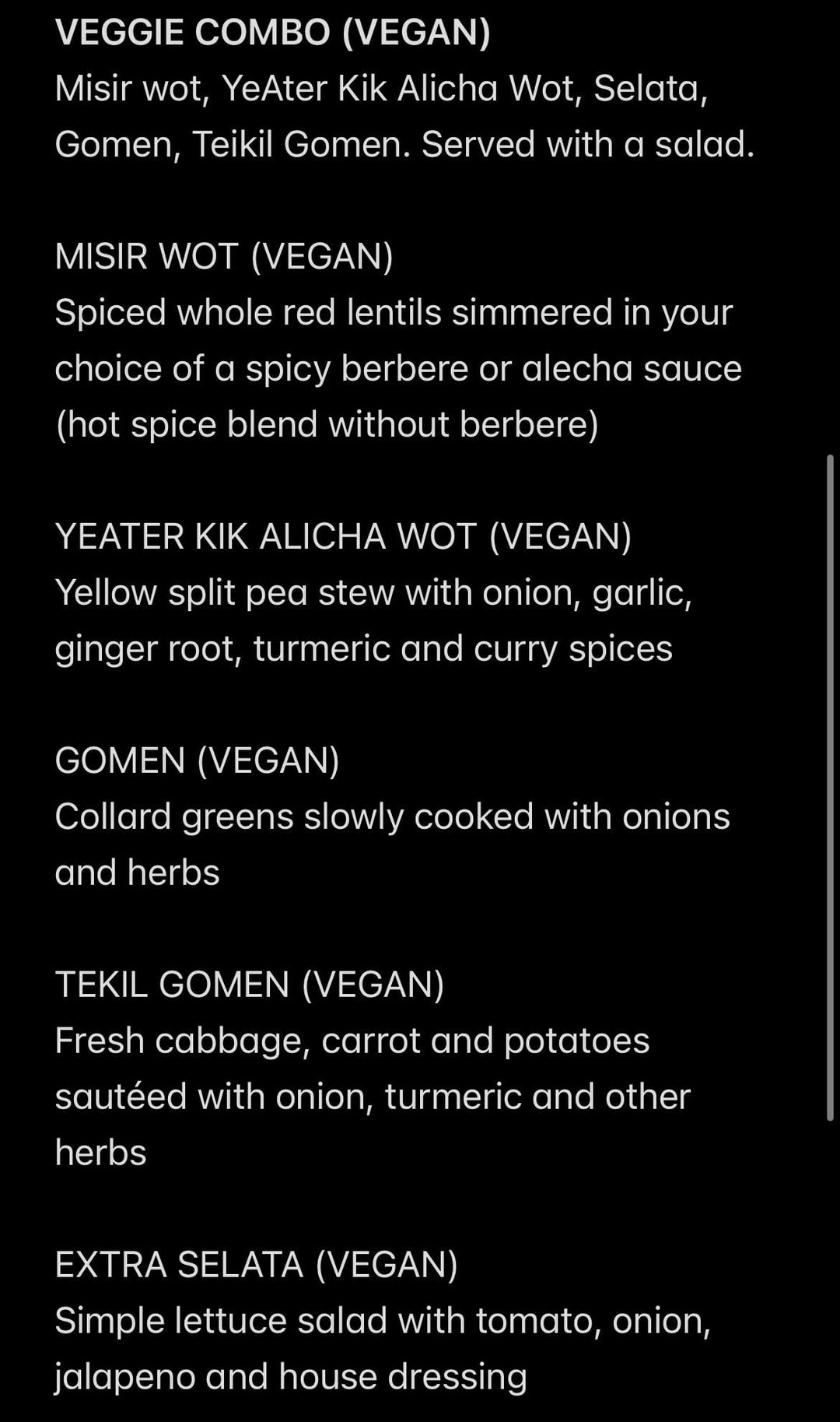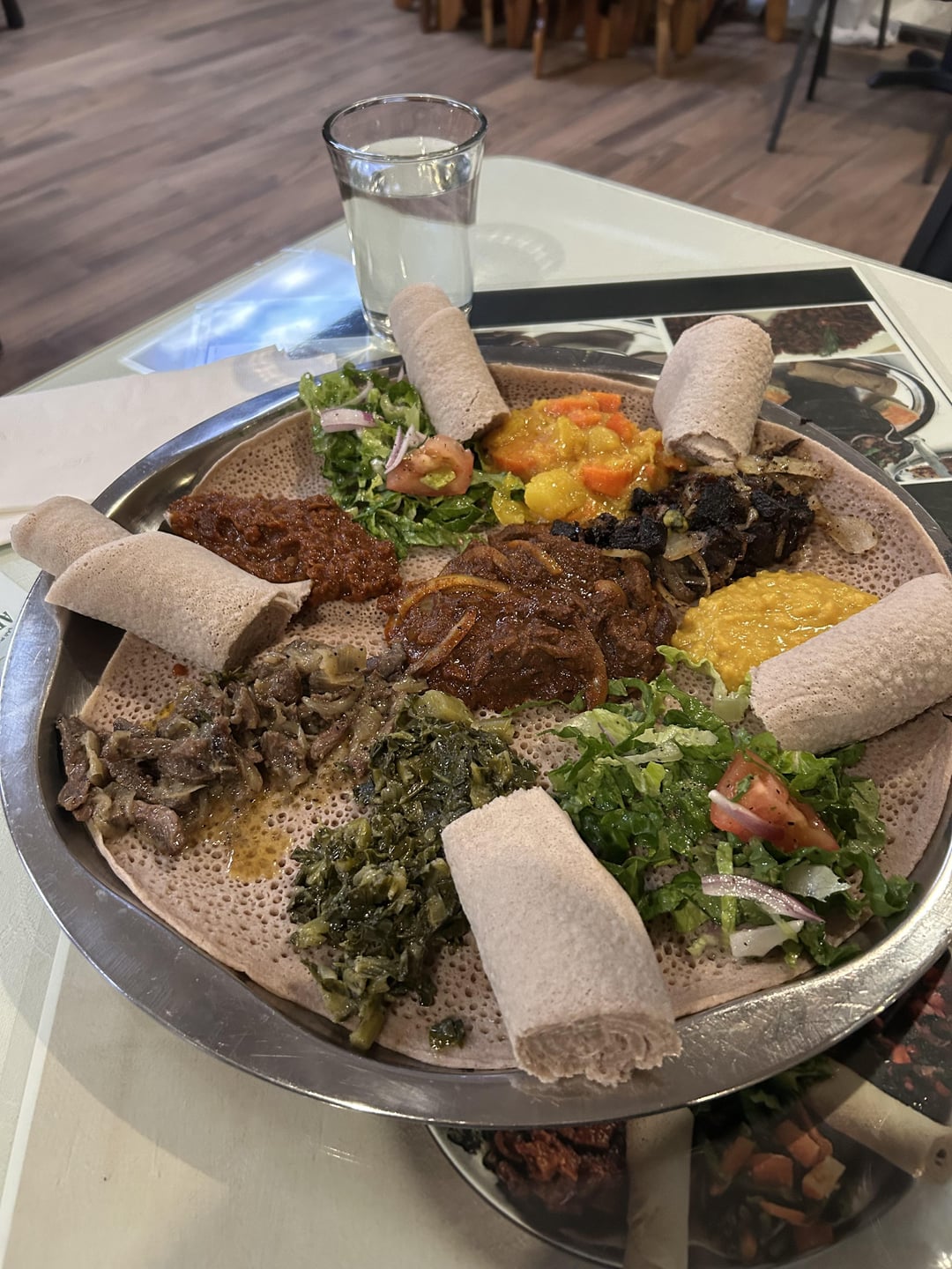 hi! i ate about half of this. my friend and i ordered the meat combo & vegetarian combo at a local ethiopian restaurant. details for what was included in each combo on 2nd and 3rd photos! it would be great if anyone could provide their best estimate for the whole platter and also half of it. thank you!! 😇