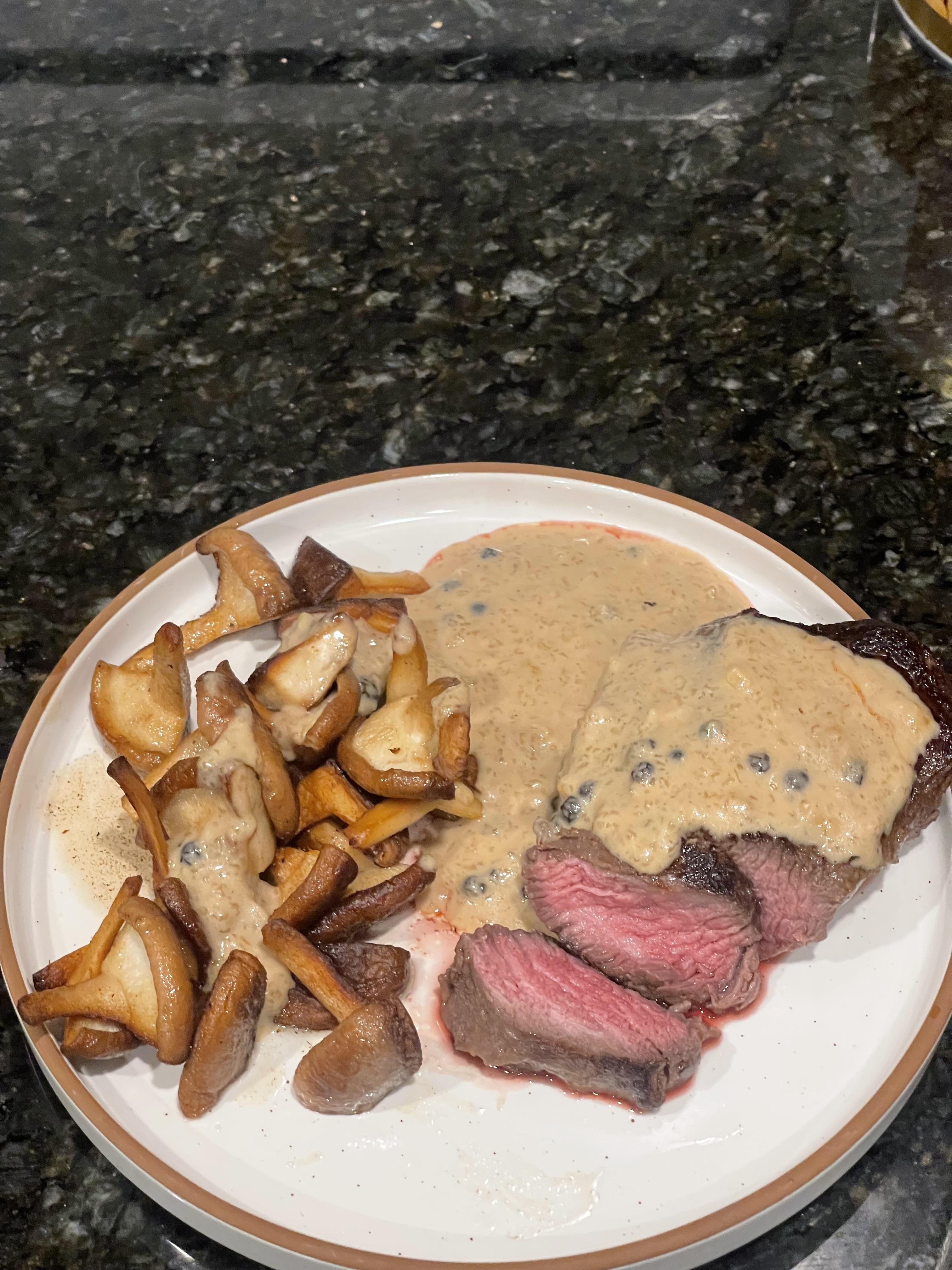 With a simple peppercorn sauce I found, and made enough of to freeze and vac seal.