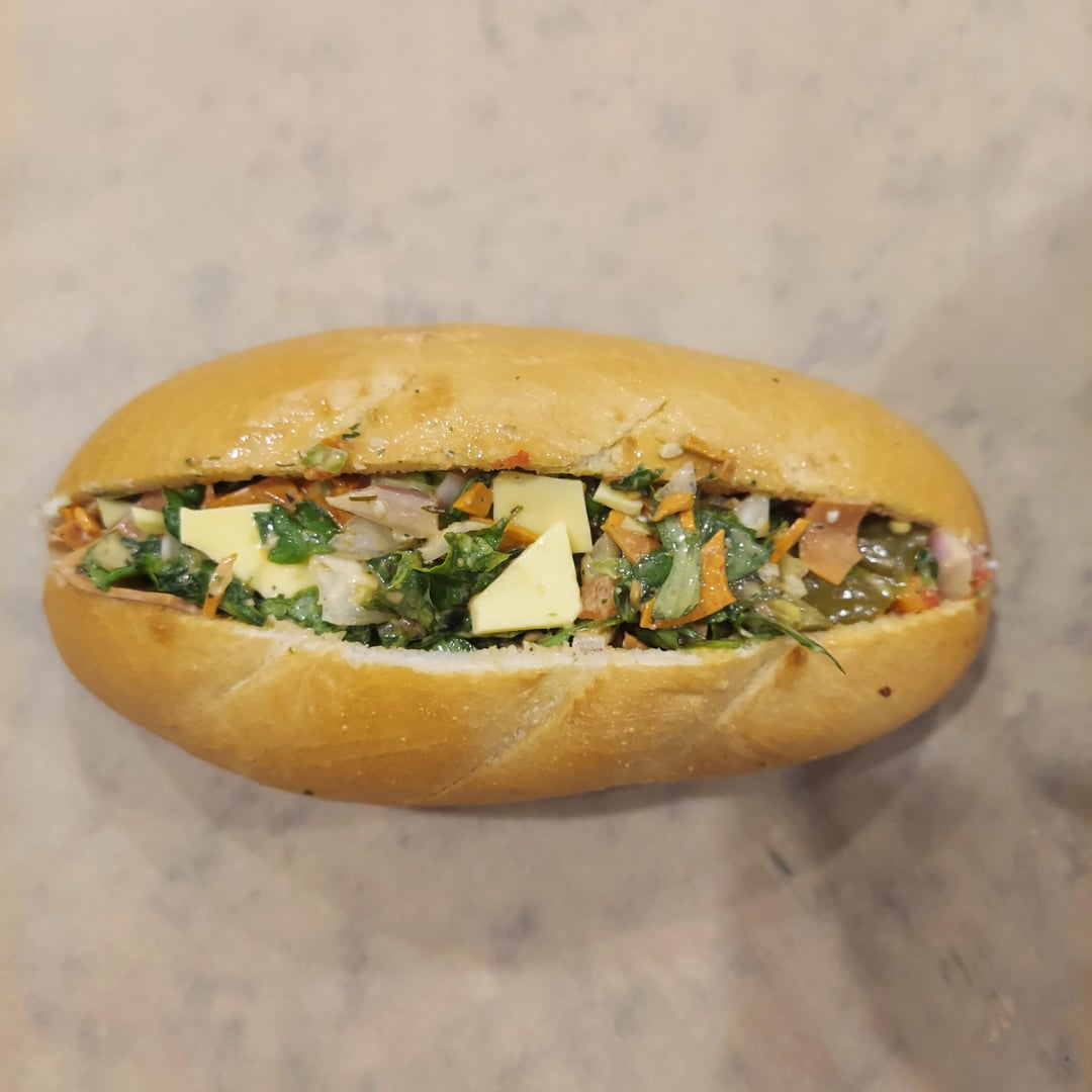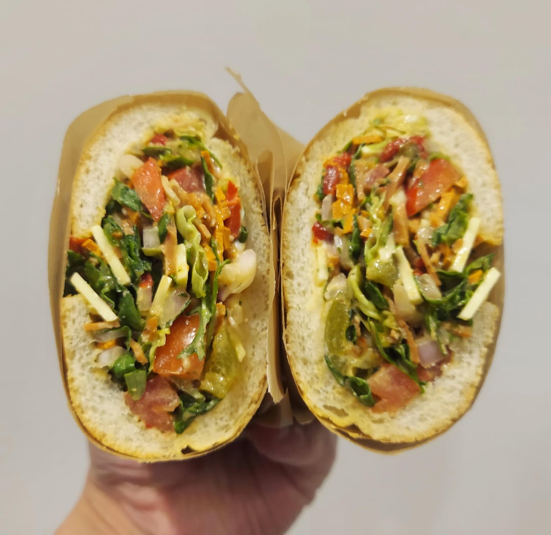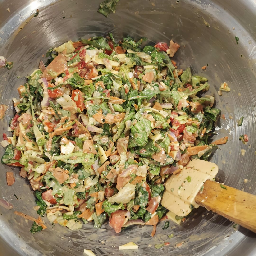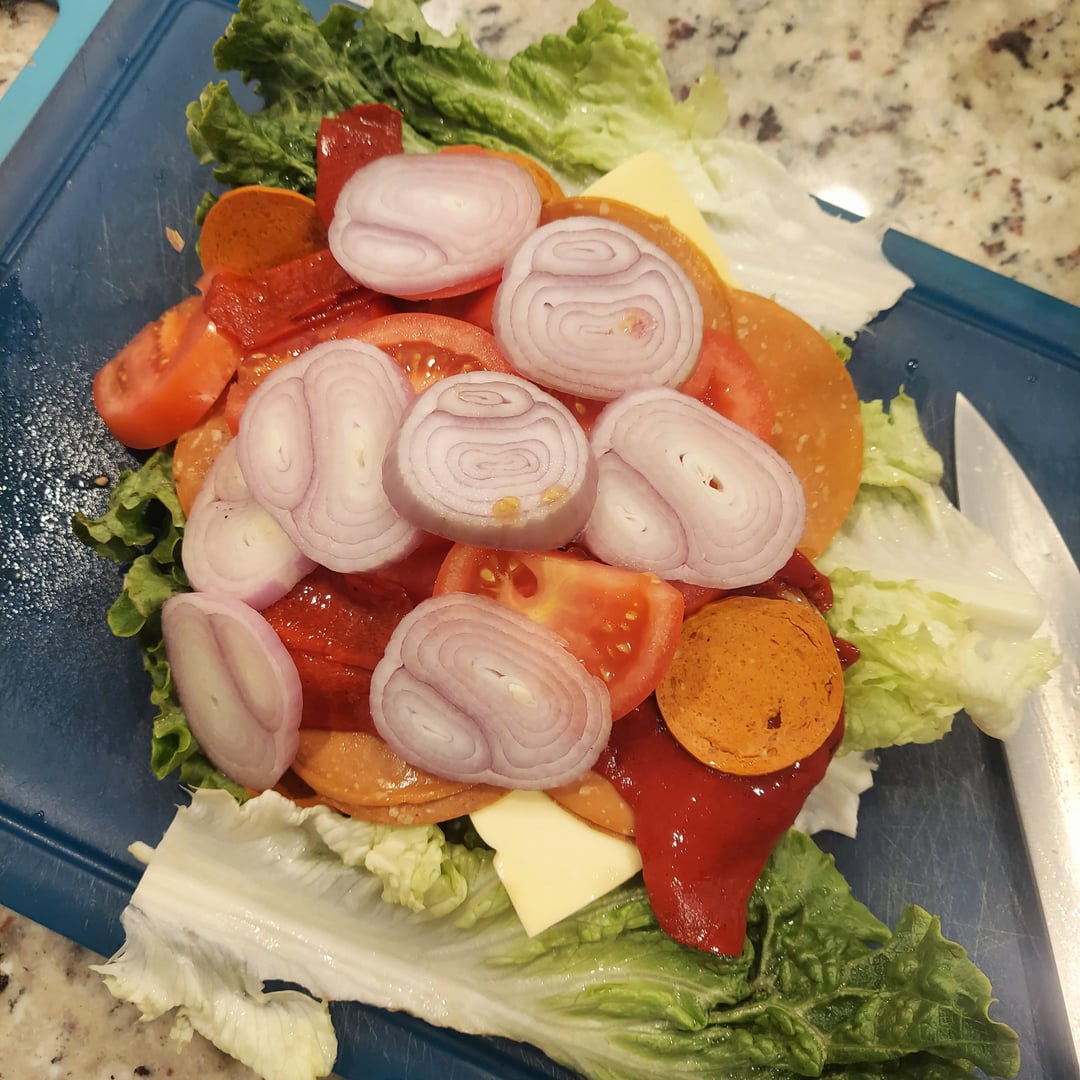 6) Start with lettuce, tomatoes, a shallot, roasted red peppers, two slices of Chao cheese, TJ's pepperoni, Yves ham and salami, capers, and Italian sweet peppers