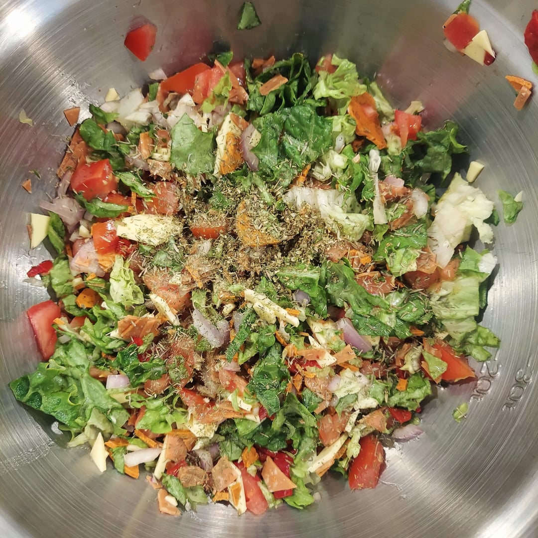 5) Chop it all up and then add dried oregano, thyme, basil, dill, salt and pepper