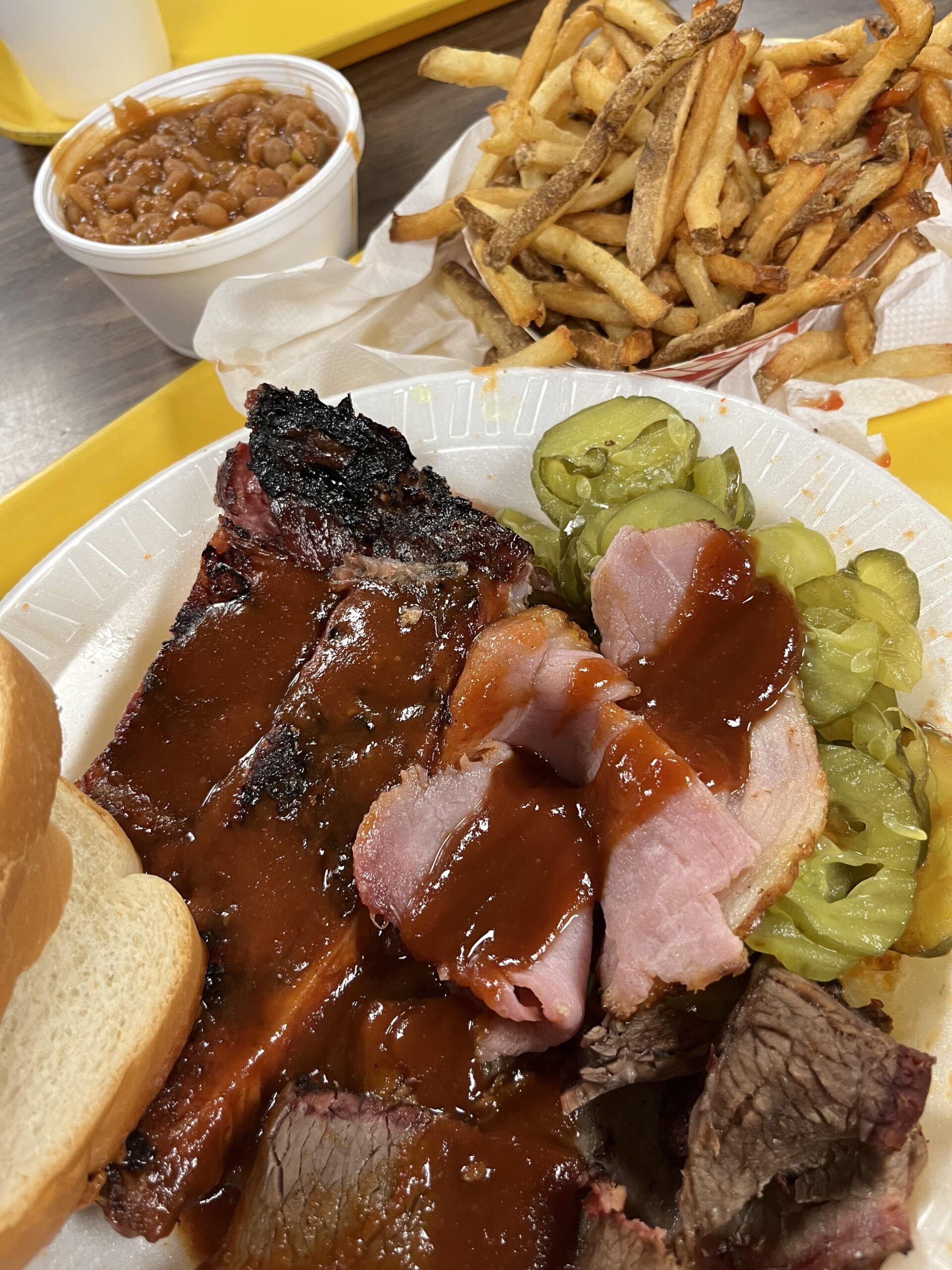 Mixed plate of ribs, ham and brisket with fries and beans. Local KC area spot, only $17.