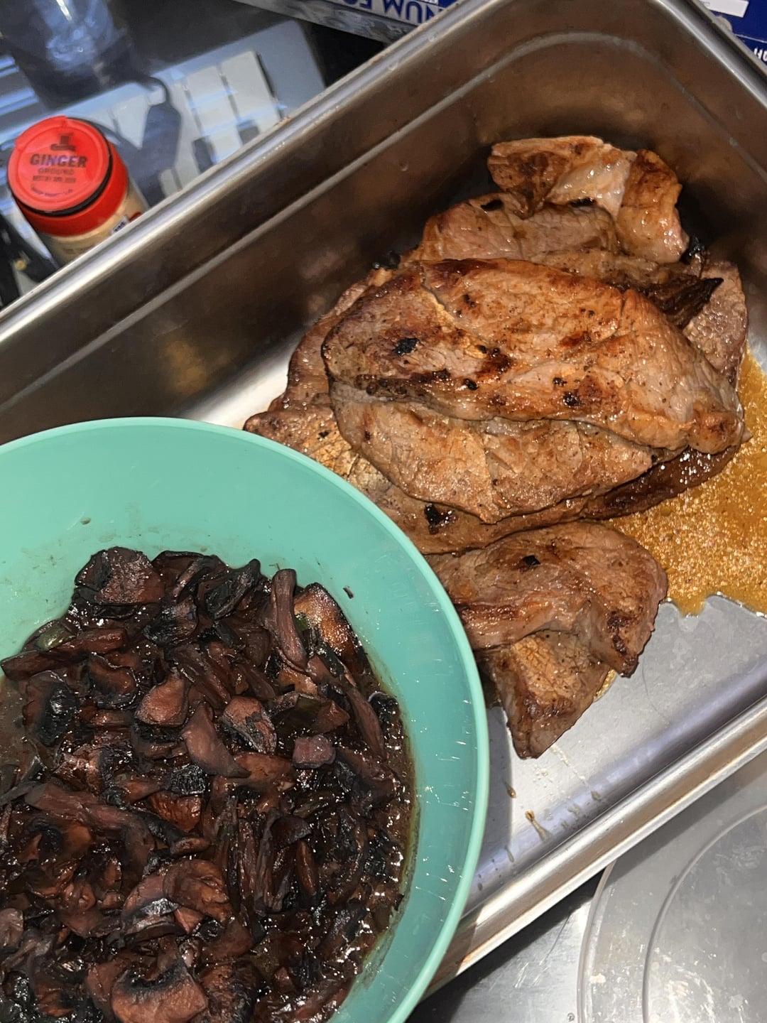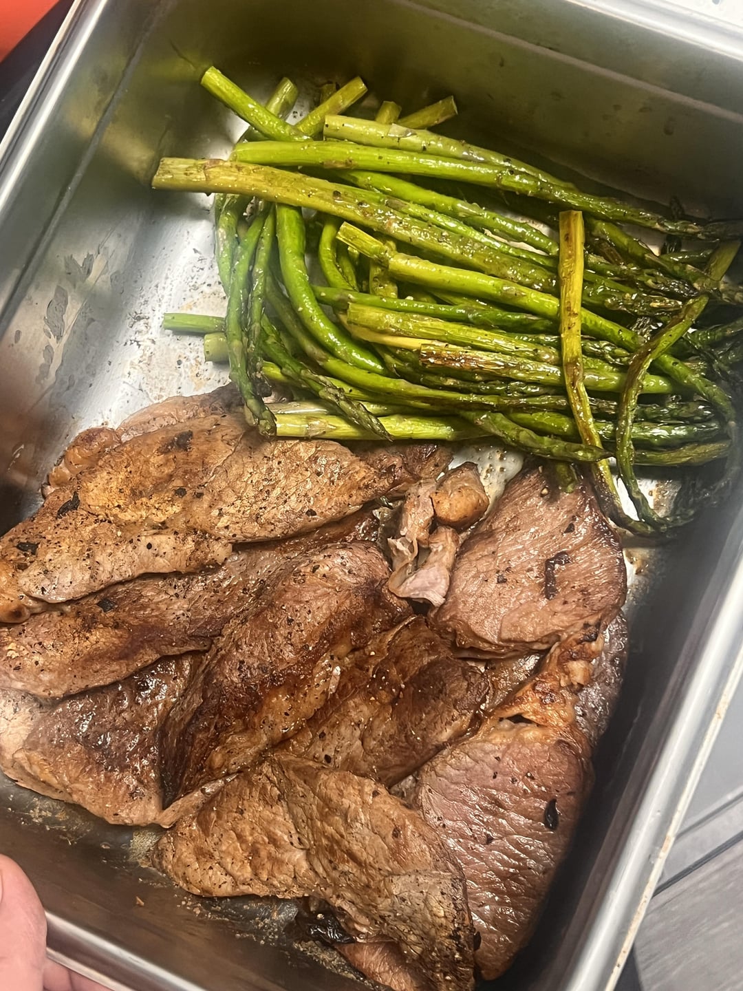 Got the cheapest top round sirloin and made some red wine mushrooms and asparagus to go with. https://www.thepioneerwoman.com/food-cooking/recipes/a8914/steak-with-burgundy-mushroom-sauce/