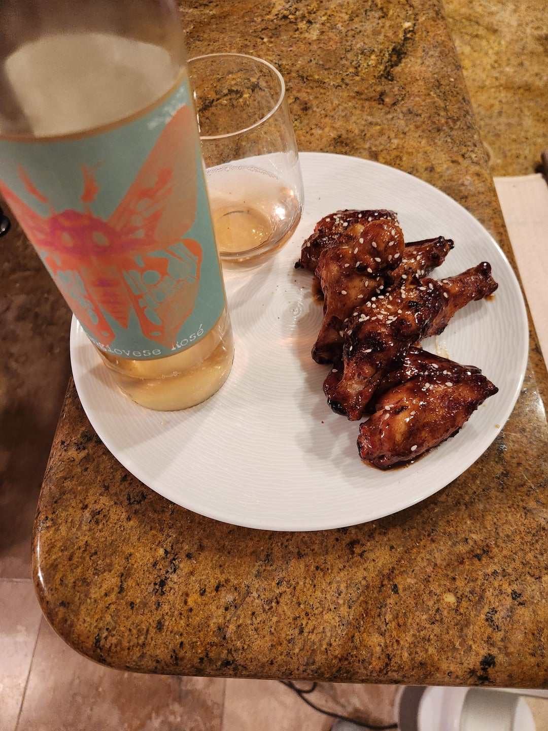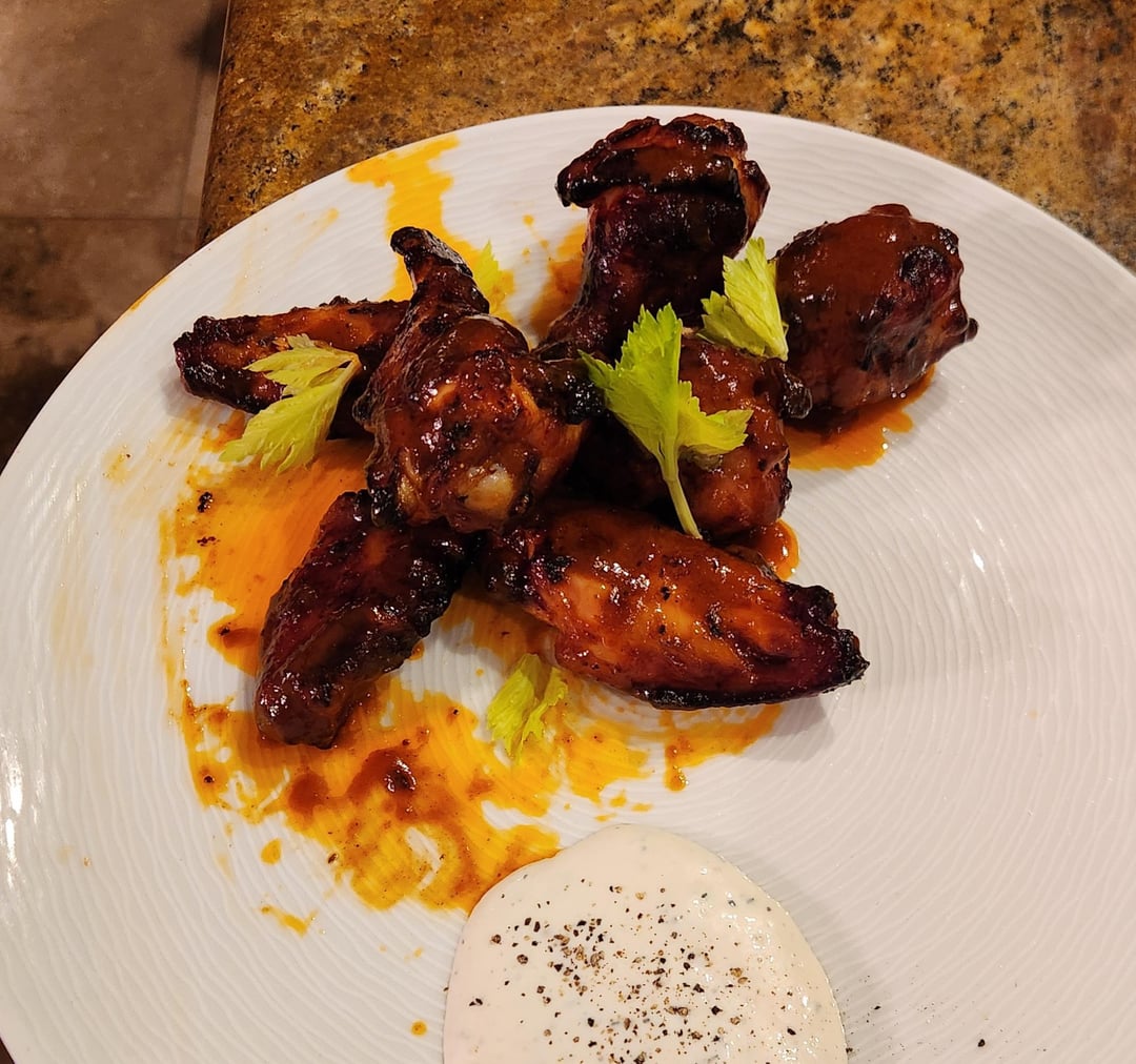Valentina: short dry brine with lemon pepper. Smoked. Air fried extra 2 min. Valentina, butter, agave nectar, ketchup splash of water