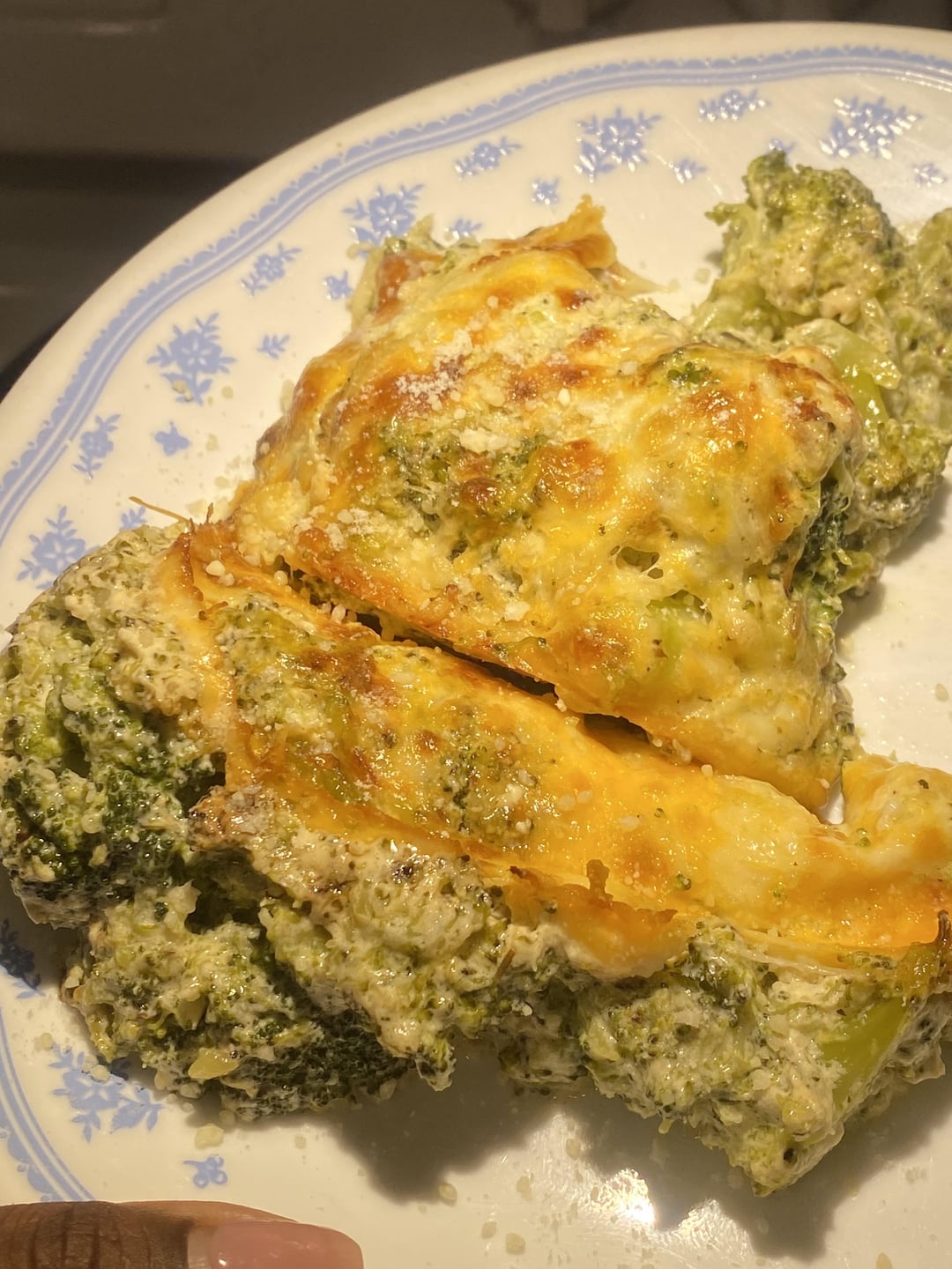 Instead of using fresh broccoli I used a 16 oz bag of frozen, roasted it in the oven for 30mins at 400 degrees F, middle rack. Then I mixed the Alfredo and broccoli together in a large bowl. Then placed it in the baking dish. I also grafted the Colby jack myself and mixed in shredded parm cheese for the top.