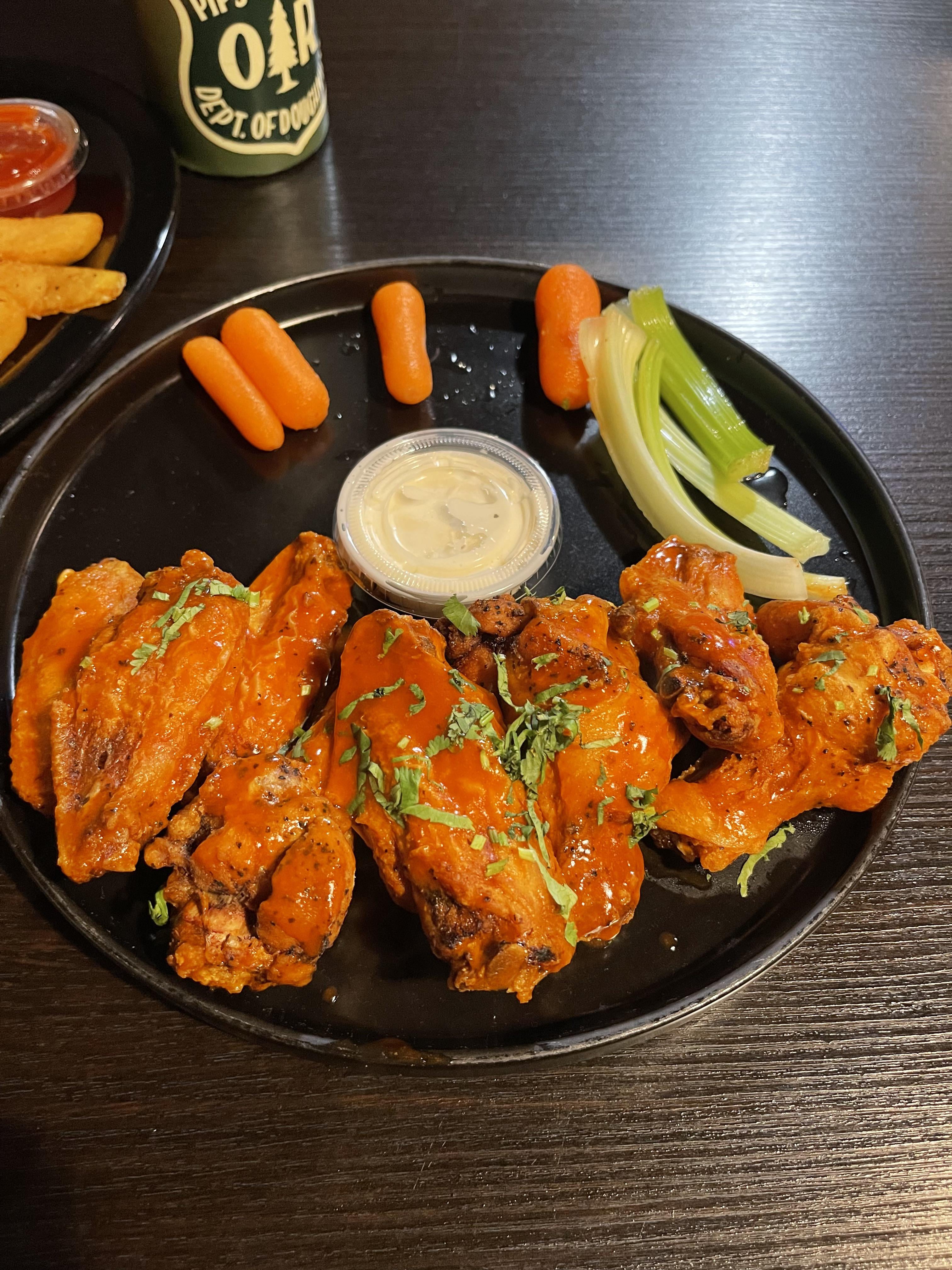 Presentation 0/10. the wings do look good, but everything else makes the presentation seem lazy. Why are the baby carrots not just cut into sticks (bite ratio matters) esp when they went through the effort of cutting the celery. Als, unnerving spacing on those carrots, just put the wings in a “clock formation” and put the celery carrots in a small bowl in the middle. The ranch/bc is still covered on wings and fries (no reason to make guests work). The herbs, not properly cut up and distributed what looks purposefully unevenly. Again, the wings look decent and seem to be almost evenly sauced and fried extra crispy, but the lack of thought on the rest of the plating makes me wonder what other things they didn’t care about.