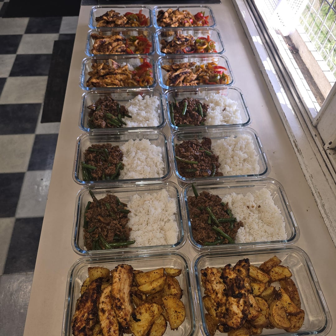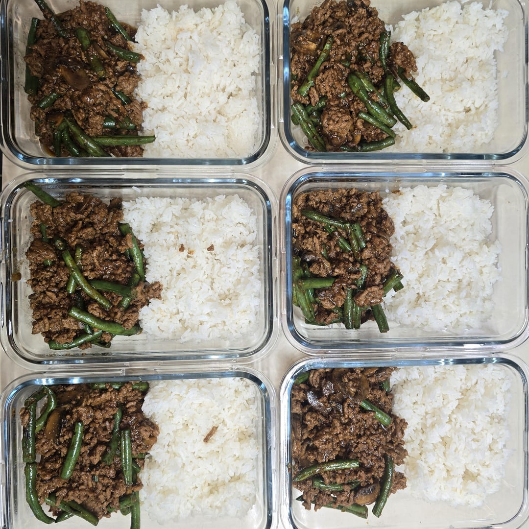 Black Pepper Beef: lean beef mince, green beans, mushrooms, black pepper beef sauce, rice.