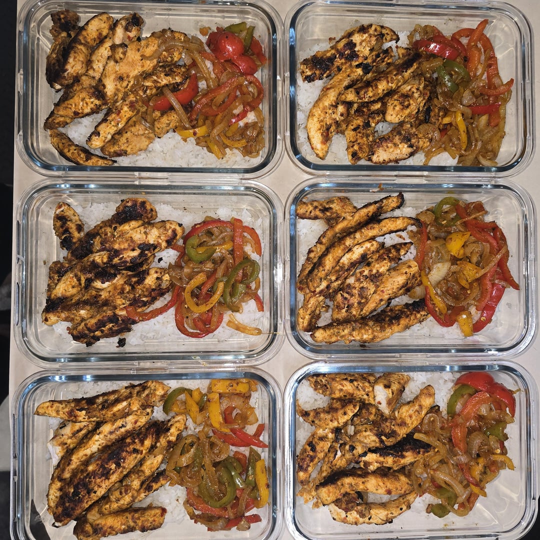 Chicken Fajitas bowls: Chicken tenderloins, capsicum, white onion, rice, fajitas seasoning.