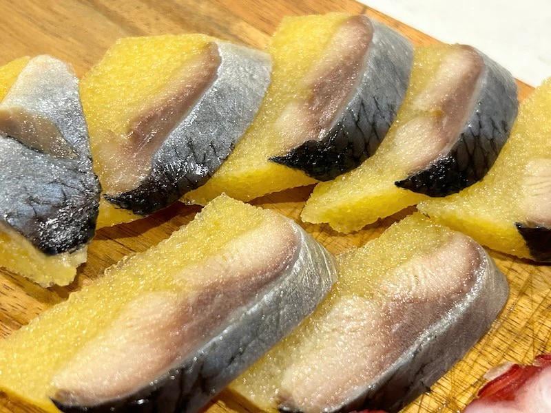 Kazunoko saba boxed sushi. Aged, salted or pickled herring roe. It is separately aged from mackerel pieces, then compressed in a box sushi, a bit of grated yam may be added in between the fish and the roe during compression to help them stick.