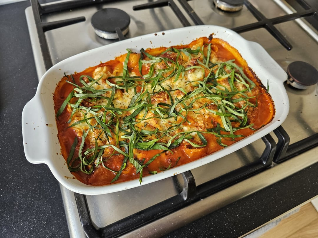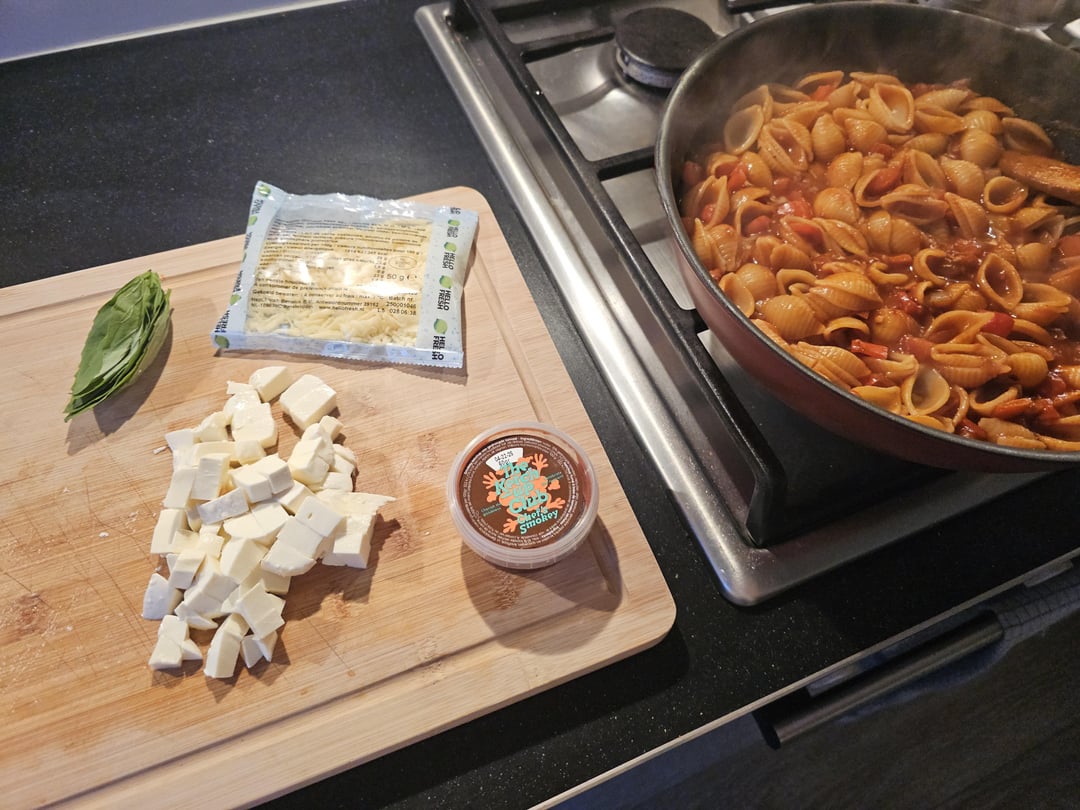 It's cooked in tomato sauce with onion, garlic, tomato chunks and red pepper has two types of cheese (mozz and Gouda) and is topped with smokey ketchup and basil. I also typically add some kind of bouillon for salt and MSG for a flavour boost.