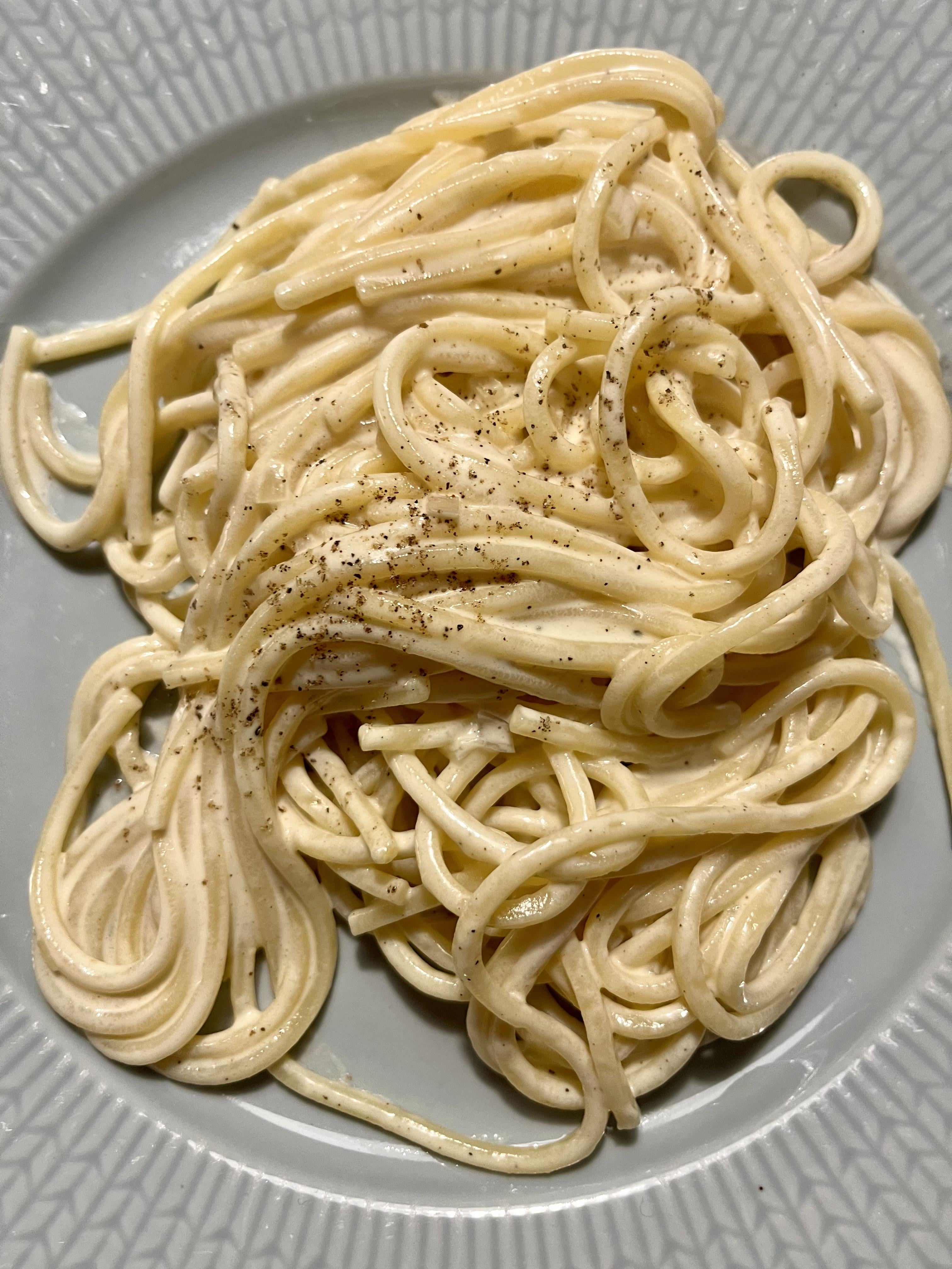 Pasta, butter, Parmigiano and pasta water. A sprinkle of black pepper on top since I like it. I think this is the dish some like to refer as Pasta Alfredo?