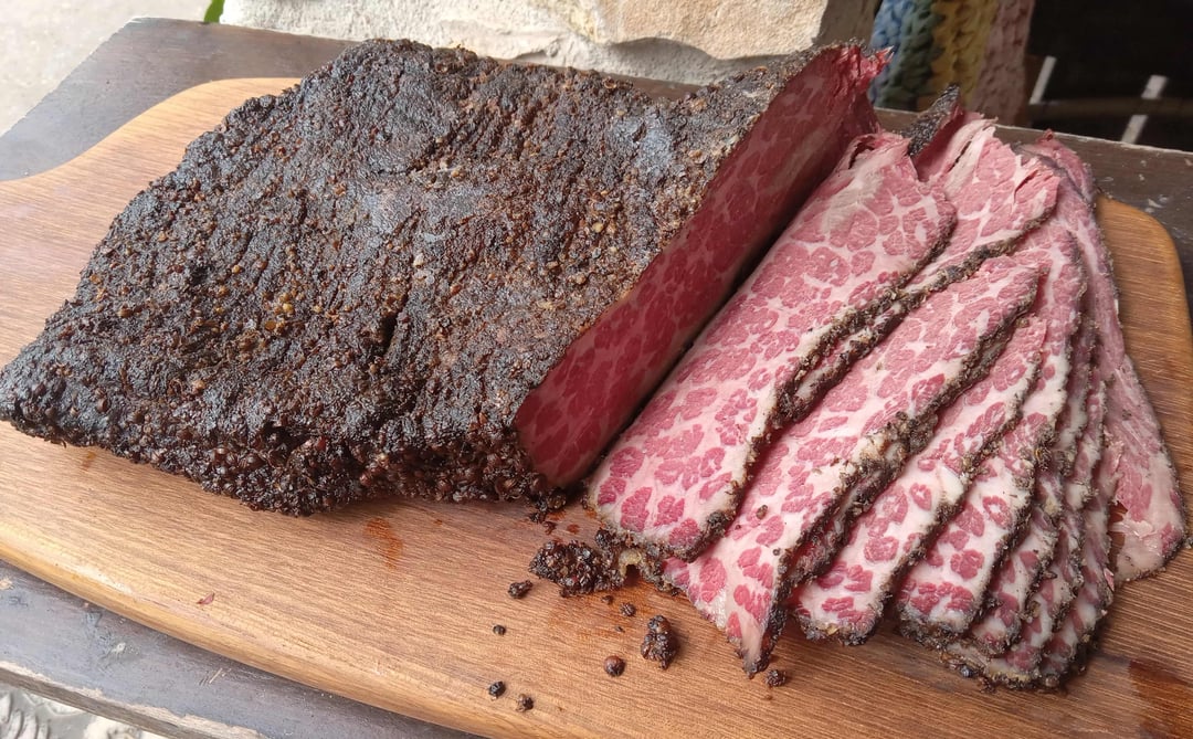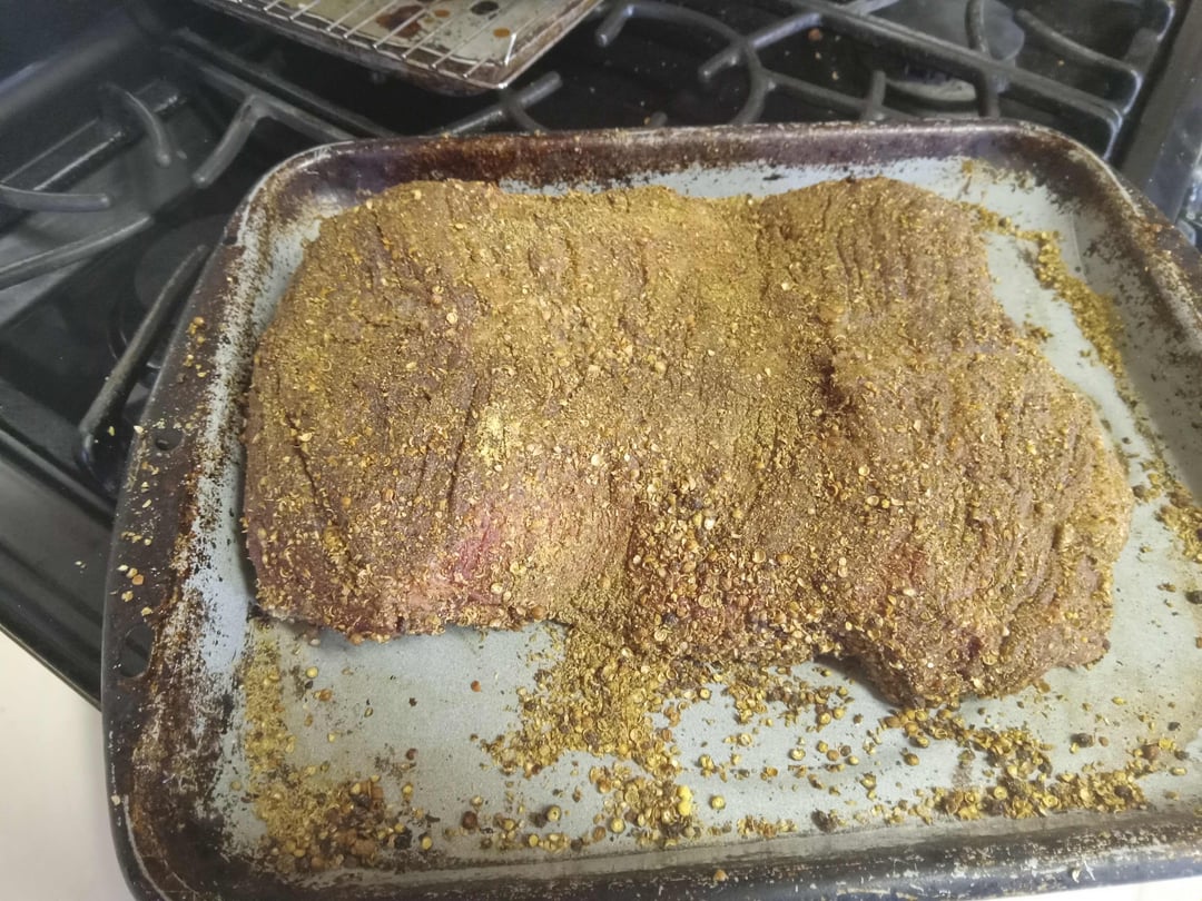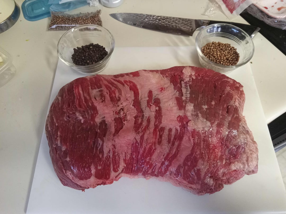 Rubbed/dry brined with with pink cure #1, salt, corriander, black pepper, granulated garlic, mustard seed powder, celery powder, and marjarom. Vaccum pack and put in the fridge for 8-9 days, flipping every 2 days and while you whip up some sauerkraut with the tiny bit of cabbage you have (usually I’d make more than 7 measly ounces 😉