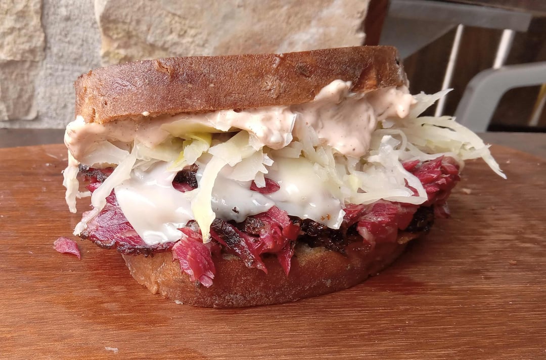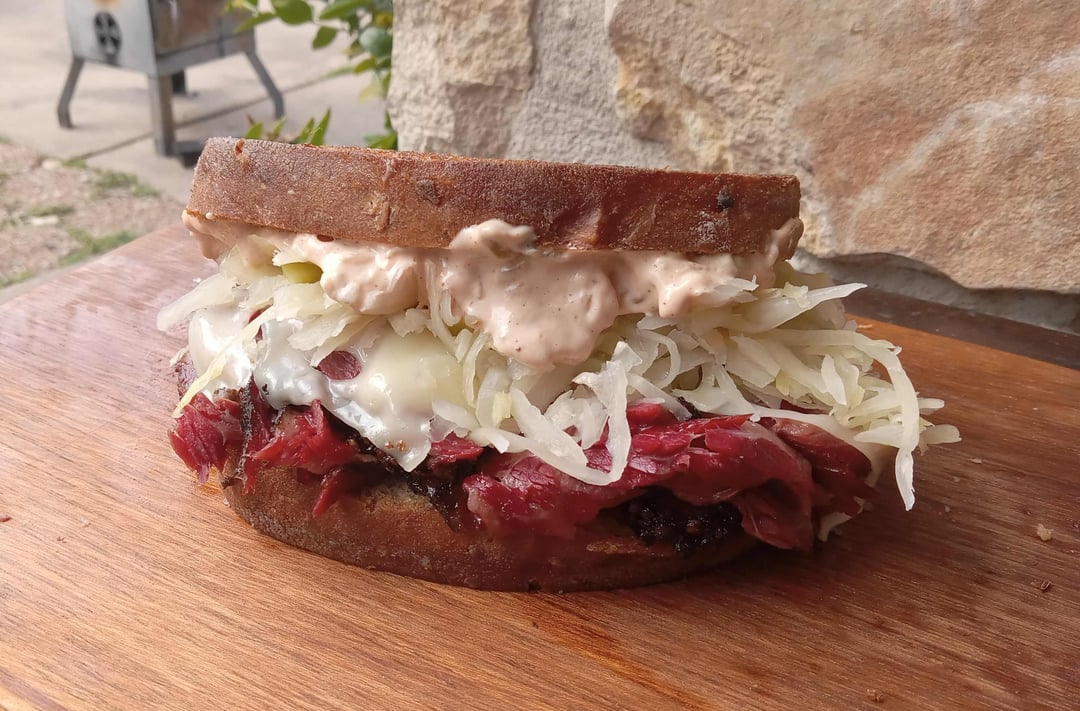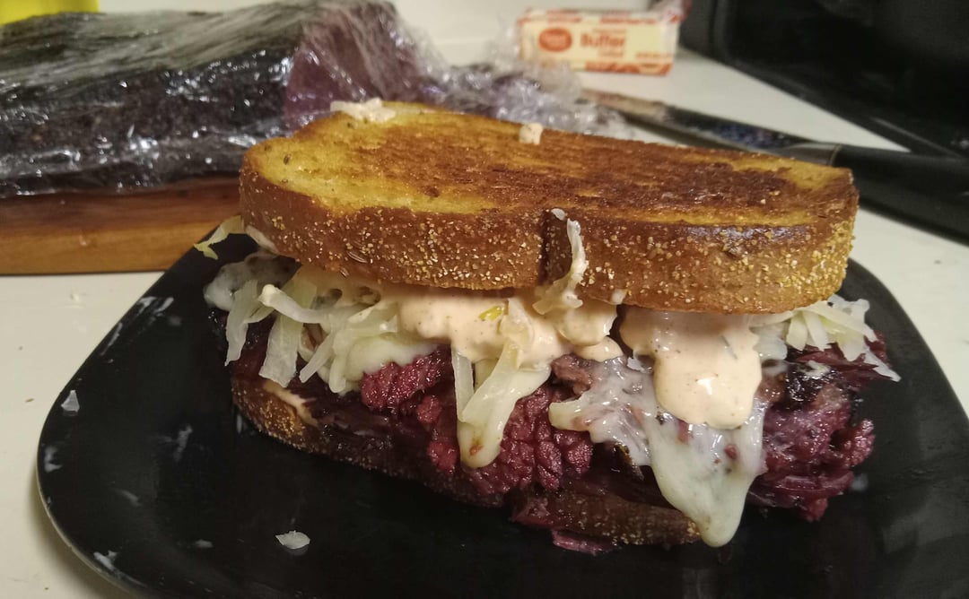 The 97.44% Home Made from Scratch Pastrami Reuben (my cow is in the shop so I couldn’t make the cheese). Method/details in comment.