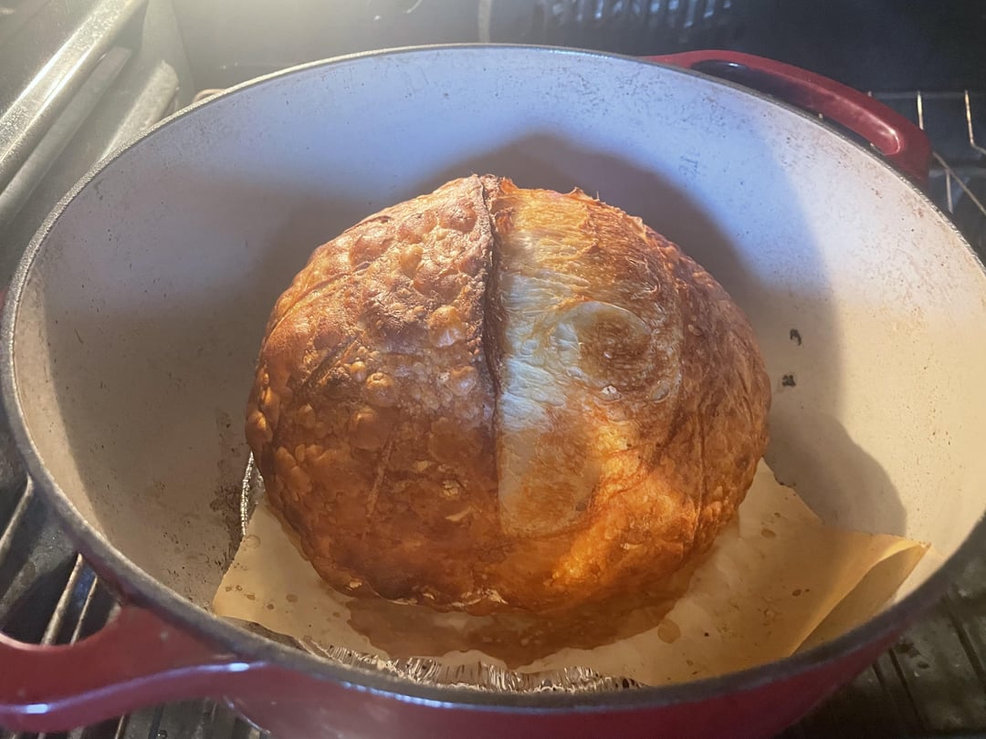 I never heat the Dutch oven up.. ever.. I had some other issues I had to work out but not that I have my loaf looks and tastes like some good sourdough bread.