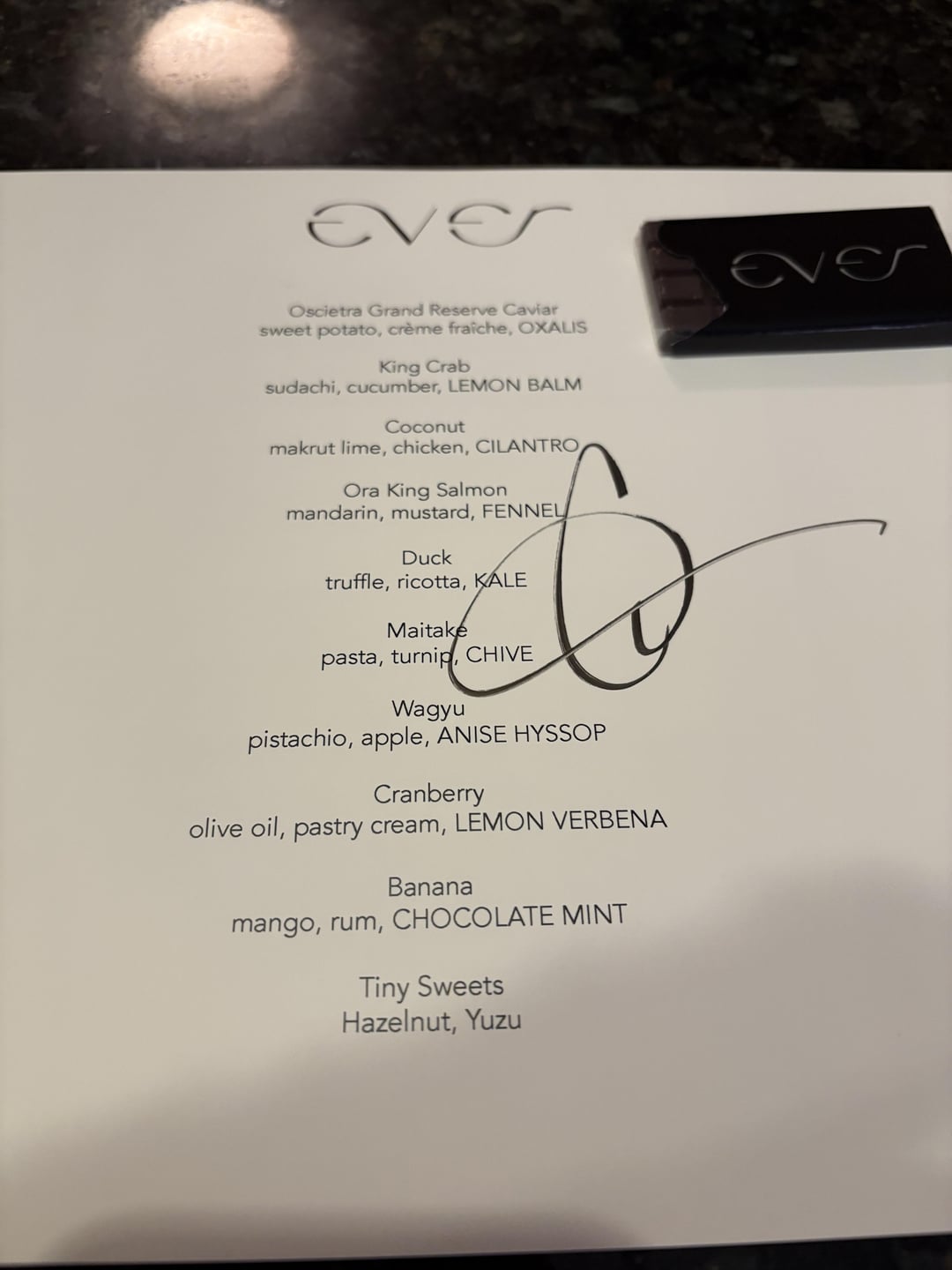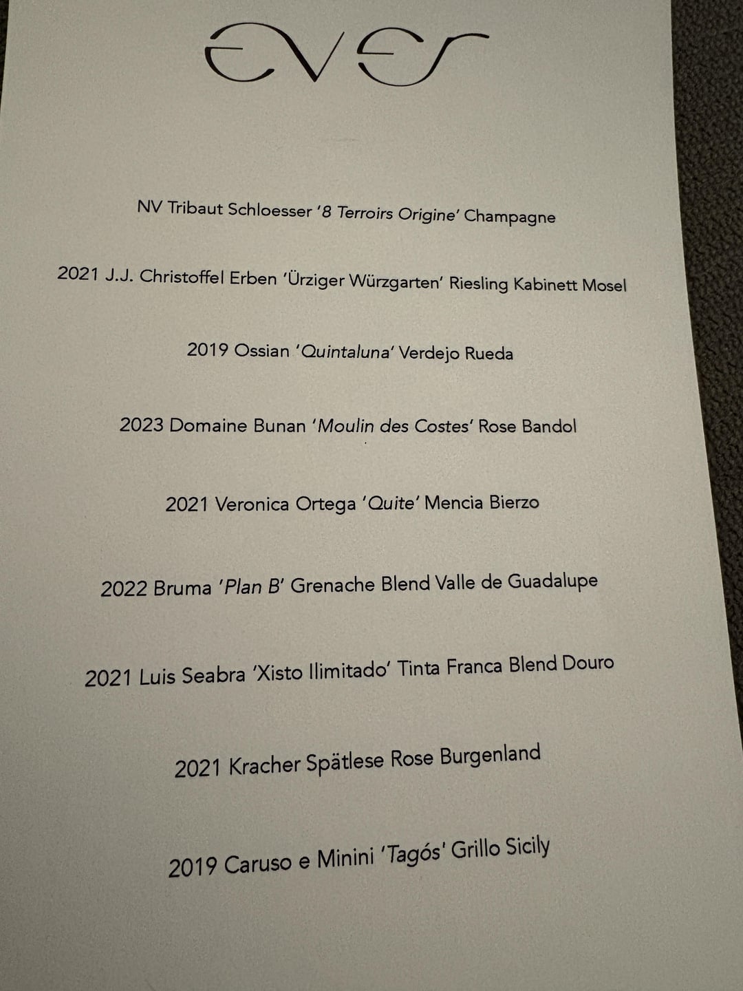 Service/Ambiance: 11/10. It’s no secret that The Bear highlights Ever in the eponymous episode of Forks. Our captain, Ulysses, was amazing. Friendly and attentive, and was so welcoming. Sometimes, service at these things can be a little cold or stuffy, and Ever was literally the opposite. Case in point, in the bathrooms, they are playing a Matthew McConaughey audiobook on repeat. You read that right. Matthew McConaughey audiobook, playing in the bathroom. It’s such a hilarious non-sequitor, and when I asked about this from Ulysses, I was just laughing my ass off at how ridiculously random it is. Also case in point, we had talked a lot about that GSM-Nebbiolo wine, and they gave us a bottle as a gift home. It’s no joke that The Bear detailed that sort of “go out and get you Pequods because you briefly mentioned it” thing that I think exemplifies Ever’s service team. Also, there was a moment where a busser dropped and broke a wine glass, so I hope you aren’t knocked down to shining forks with Cousin. It wasn’t your fault!