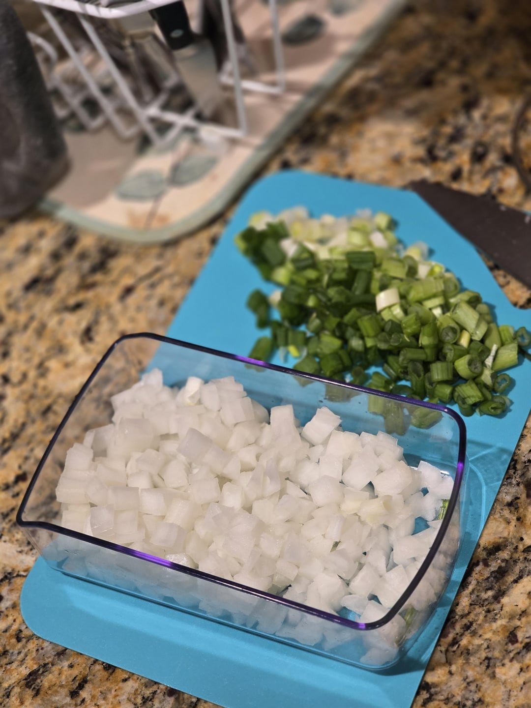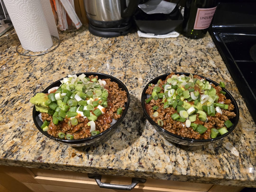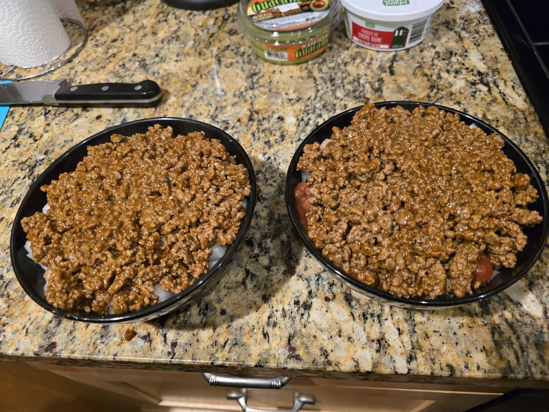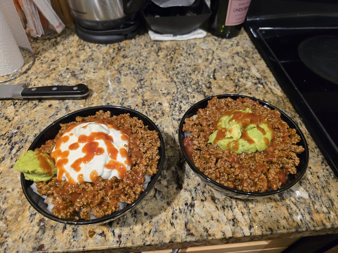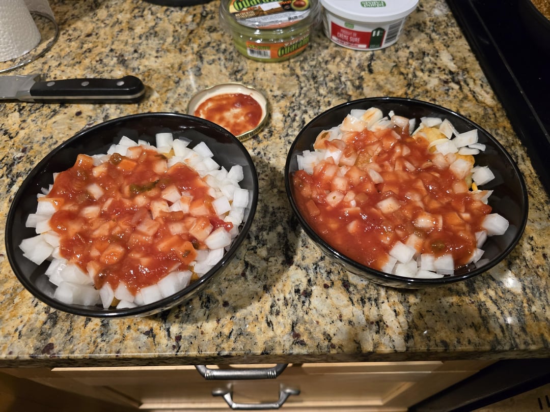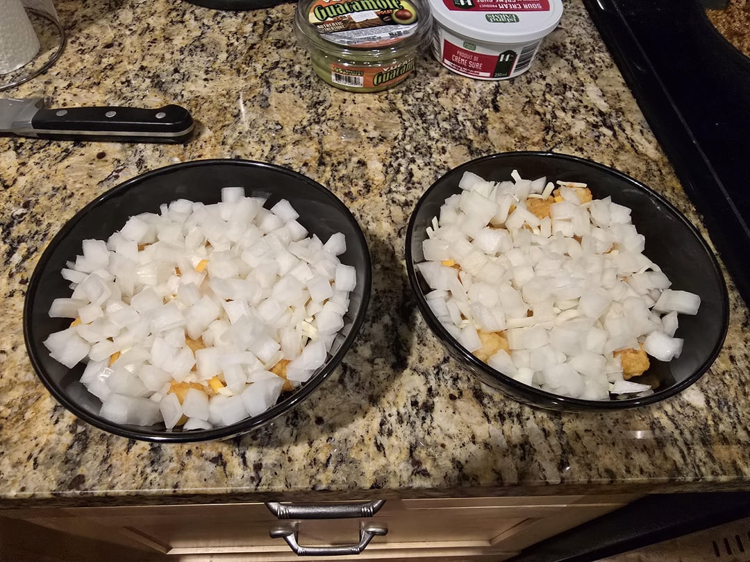 This is one of my favorite dinners EVER. Tater tots, cheese, raw white onion, salsa, ground beef with old el Paso taco seasoning, sour cream, guacamole, frank hot sauce, and green onion. So fast, so cheap, so onion 🤤😍