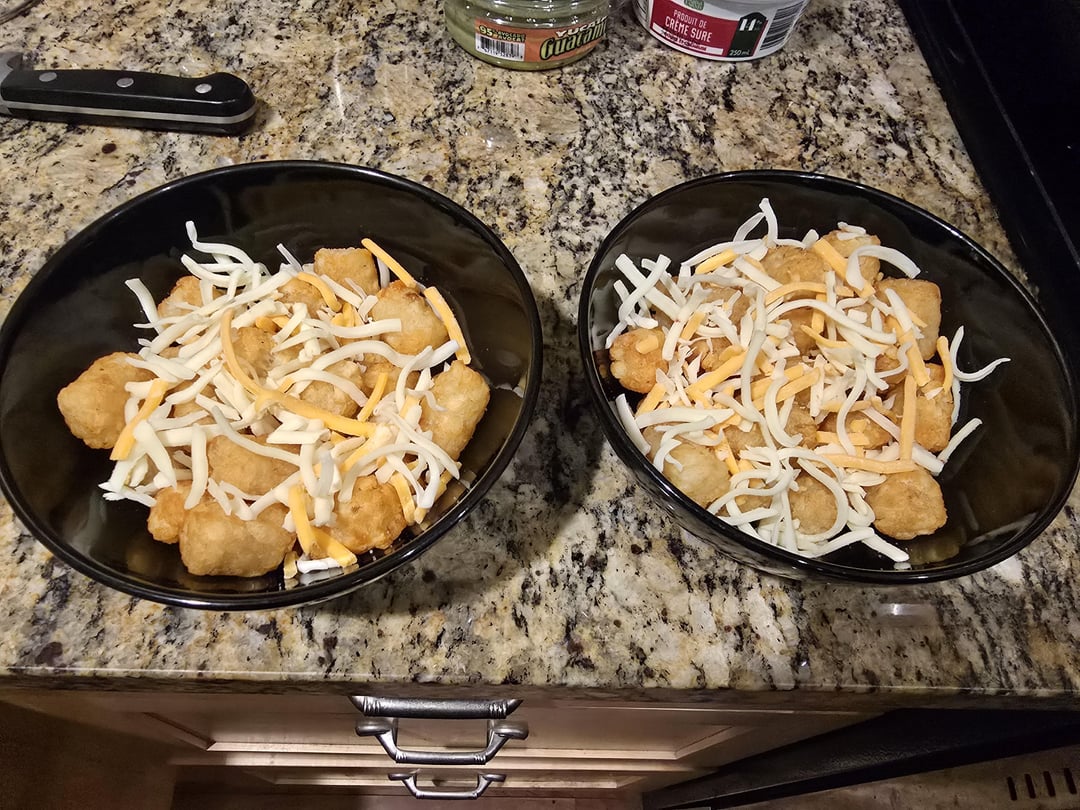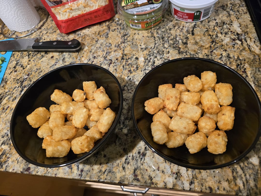 This is basically how I make a taco salad except I replace the tots with some form of lettuce. usually shredded cabbage and carrots and iceberg.