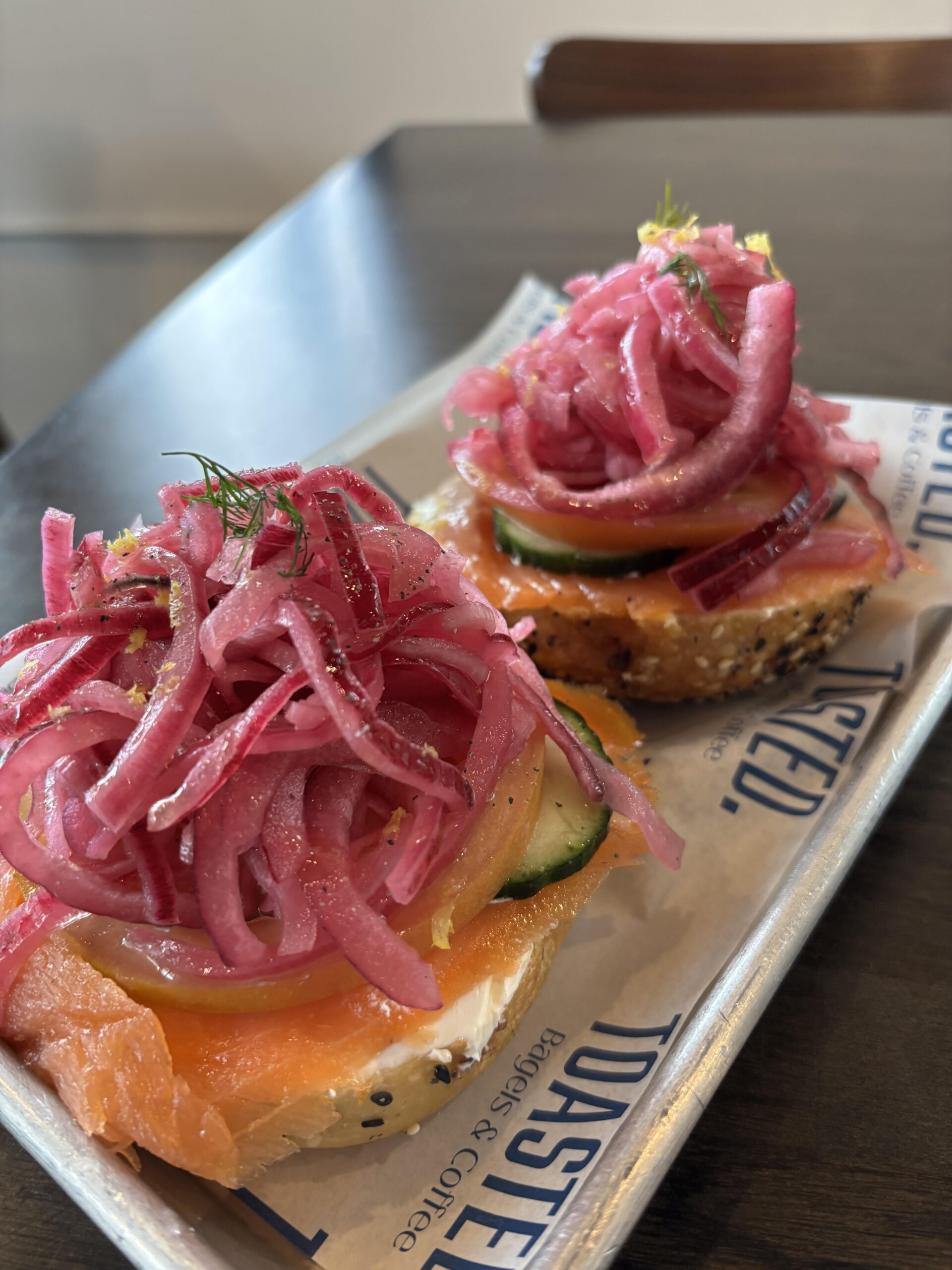 Looks so inviting though I’ve never had bagel, lox and pickled onions, they’re not offered anyplace ive been!!