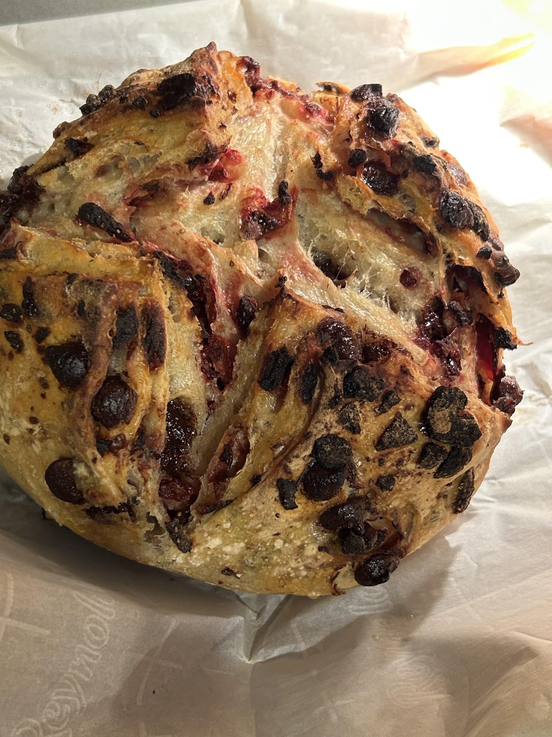 Added milk chocolate chips during stretch and folds and freeze dried strawberries during final shaping