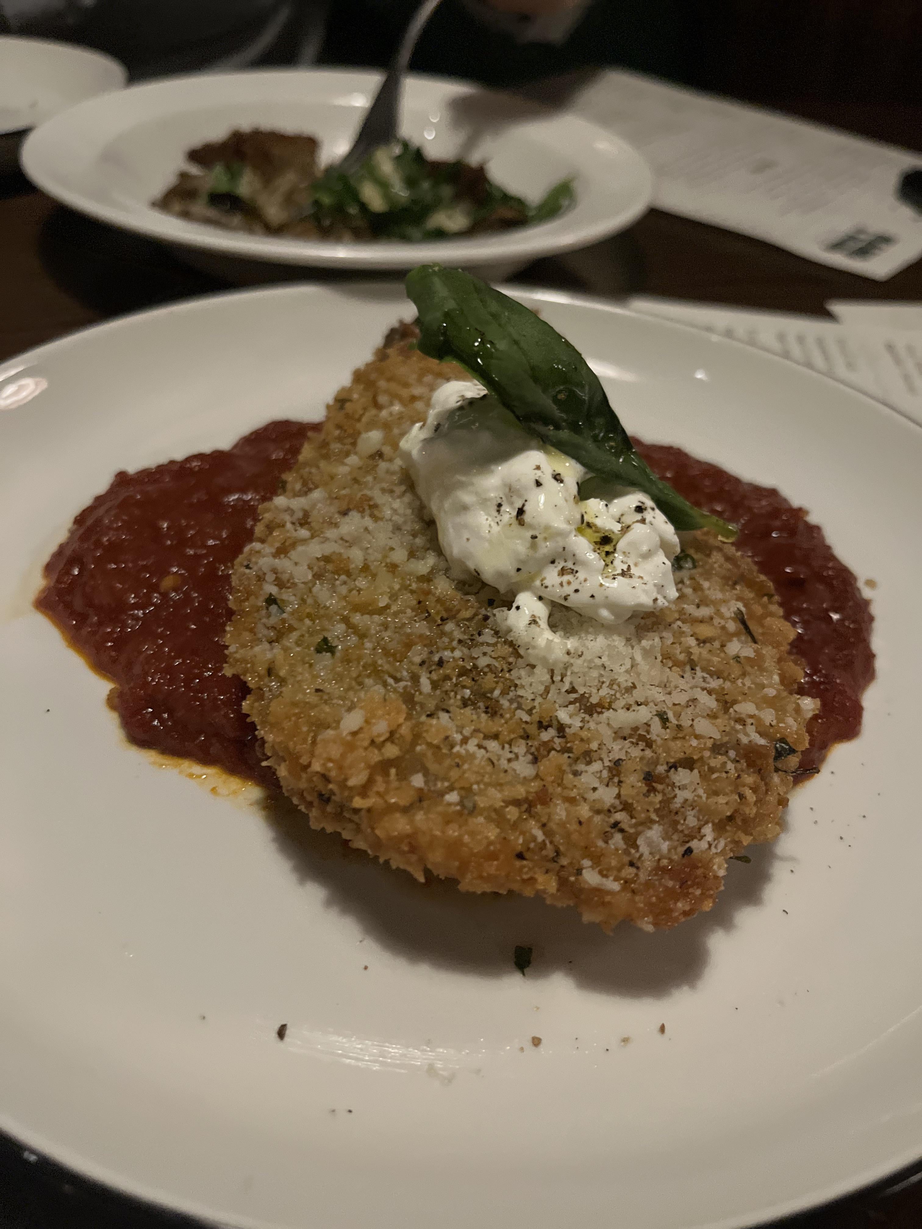 Eggplant cutlet is insanely good (pictured). Can’t skip. Crunchy breading, zero sogginess here, craveable red sauce. Pappardelle was great, but the waiter told us pastas were largely portioned, not sure why they’d say that to sway you to buy less pasta but I thought they were mid sized portions at best.