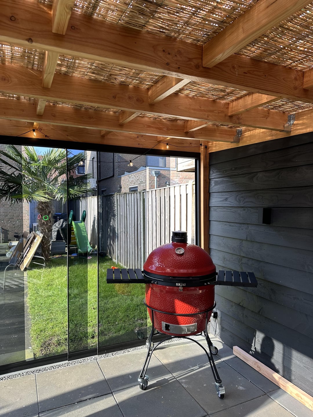 That setup looks great and it will be a smokey mess under that roof. I recommend a small stone patio for the grill outside