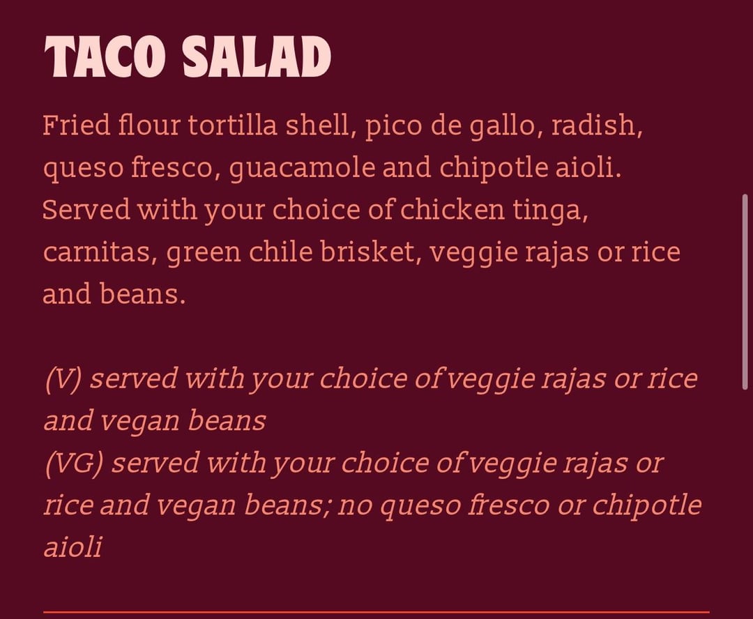 DiscombobulatedBus81 12 months ago hey david!! πits been a minute bro. hope youre having/had a great valentines day brother…let me try and help ya out heretostada shell ([nutritionix reference](https://www.nutritionix.com/food/taco-salad-shell); fried; β60-65g) β300pico & radish (fresh) >25queso fresco ([cacique reference](https://www.caciquefoods.com/products/ranchero-queso-fresco/); β45g) β150gauc (fresh; average; β1/4 cup or β65g) β125chipotle aioli ([stonewall reference](https://www.stonewallkitchen.com/chipotle-aioli-111323.html?srsltid=AfmBOopt8-XR5wZkLMTH2_zA3lL52Wd0WyDPPlnkKyrA7zN1T_4E5glS); β25g) β150chicken tinga (β4oz or β110g cooked) β200running estimate: β***950 calories!*** π«Άπ½