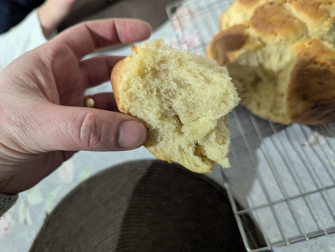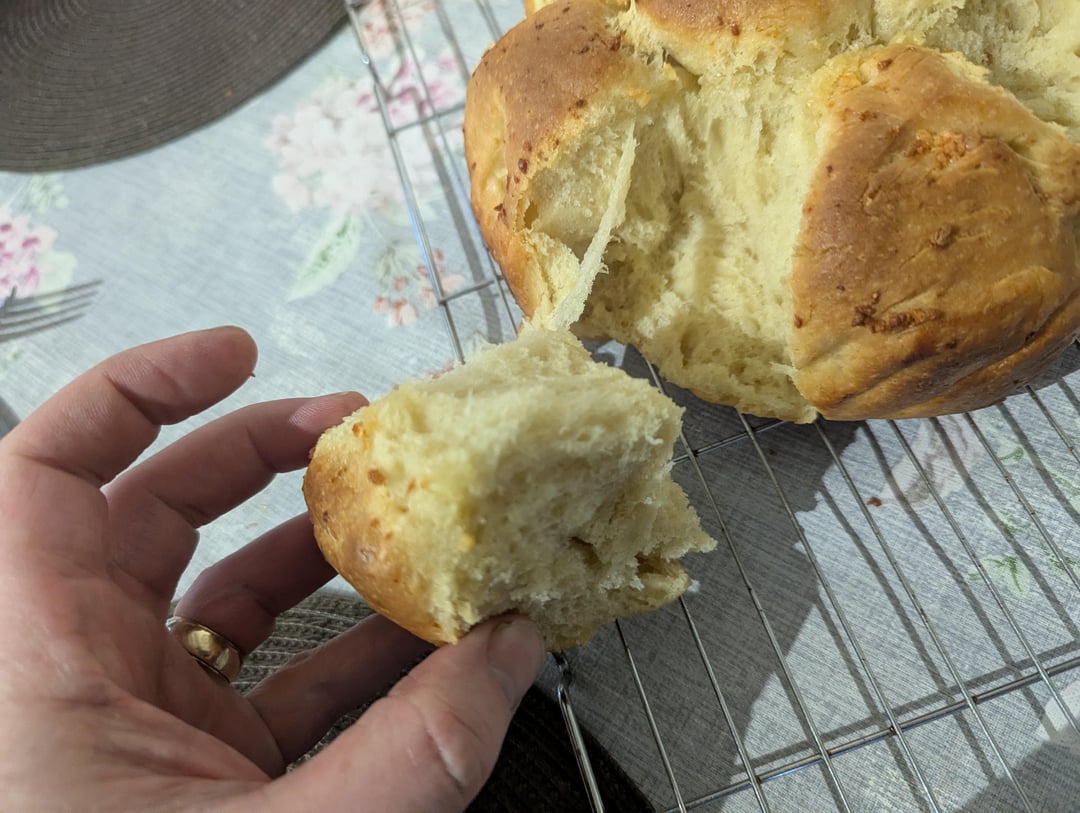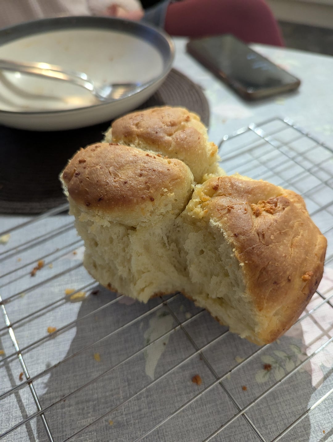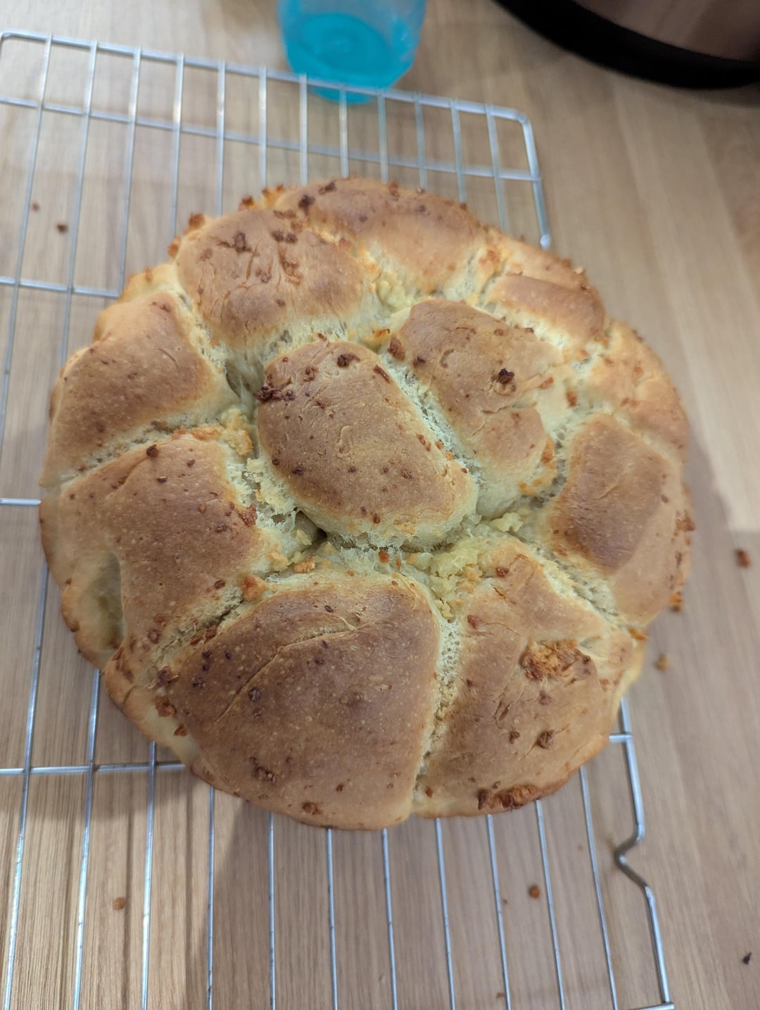 500g Strong White Flour, 10g Salt, 7g Yeast, 40g Caster Sugar, 50ml Rapeseed Oil (Canola), 350ml Water (ish, I just eyeball the water now). 5 mins on the stand mixer, 1 hour prove, split in to balls, stick in wide cake tin, 30 mins prove, smother in butter and crushed garlic. Bake at 180°C for 30 mins, smoother in more butter and crushed garlic, cover and backed for a further 15 mins ish (until the probe thermometer reads over 95°C in the centre of the bread).