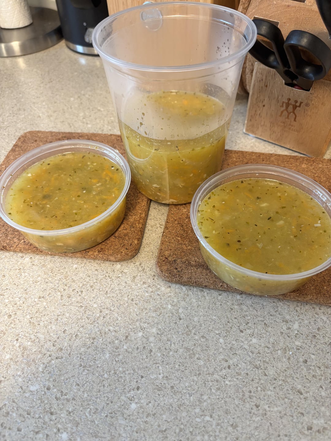 My usual meal prep strategy is to make something I’m going to have for a meal and make enough to store it both for the week and for the future. I made my normal roasted tomatillo salsa with tortillas jalapeños, onions, garlic, roasted in olive oil. Then I purée and added in some of my frozen chicken stock. I had experimented with some frozen air fryer chicken chunks I made and plopped those in. The salsa was a little bitter, so I had to add a little bit of oregano and honey, and a bay leaf. I’ll have soup for the weekend and two servings for the future. This is one of the best things to use up old tortillas or tortilla chips.