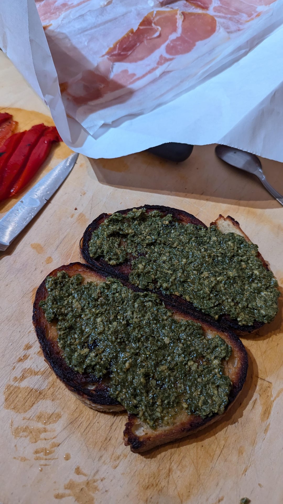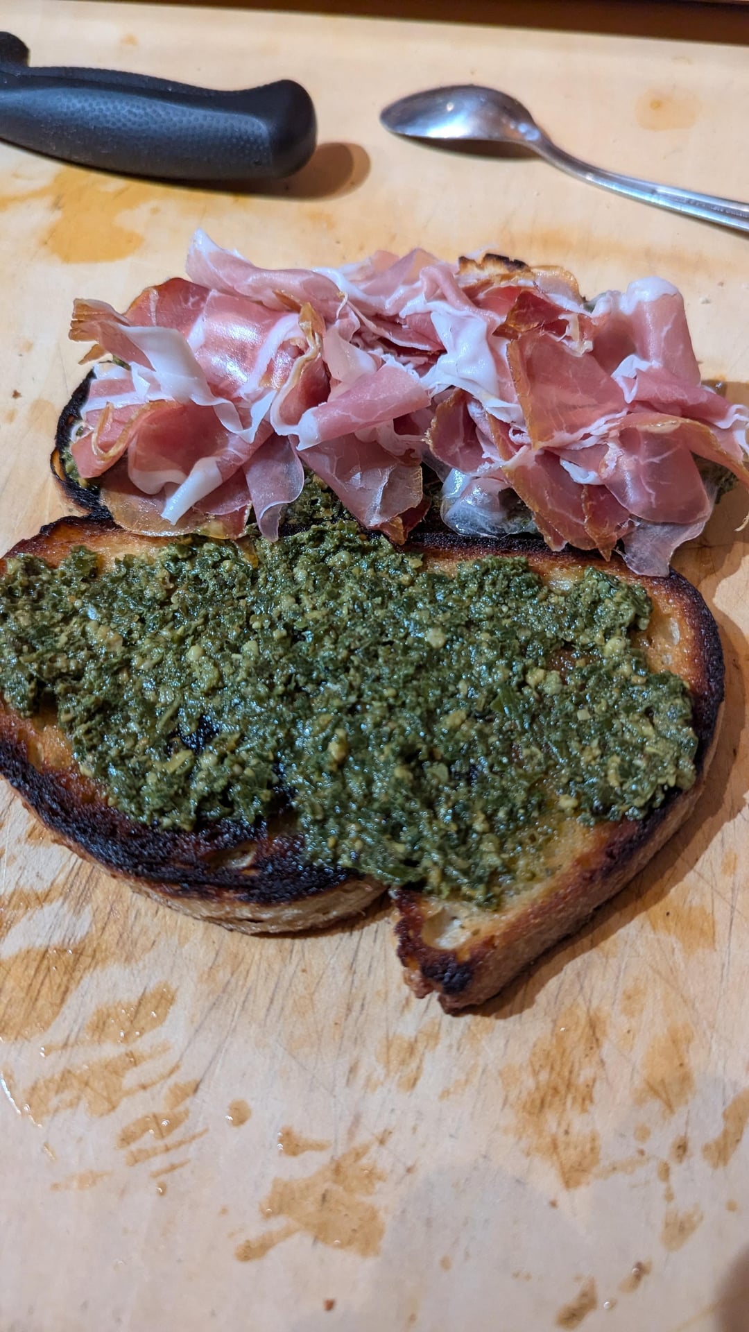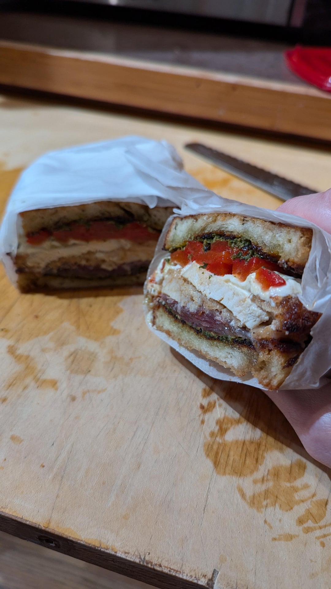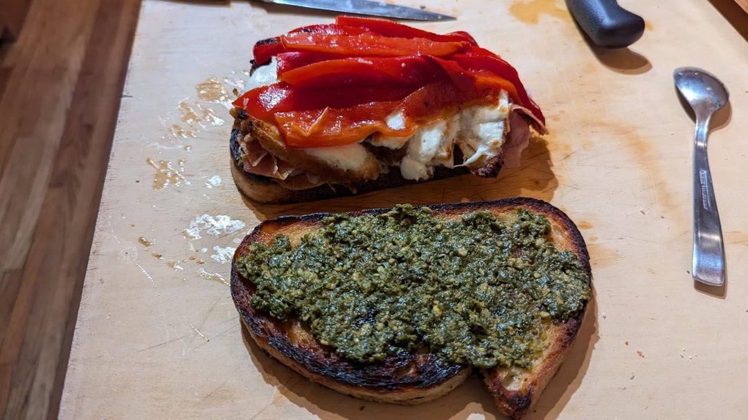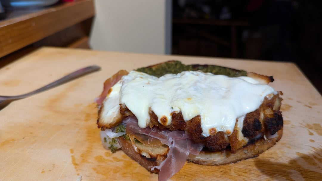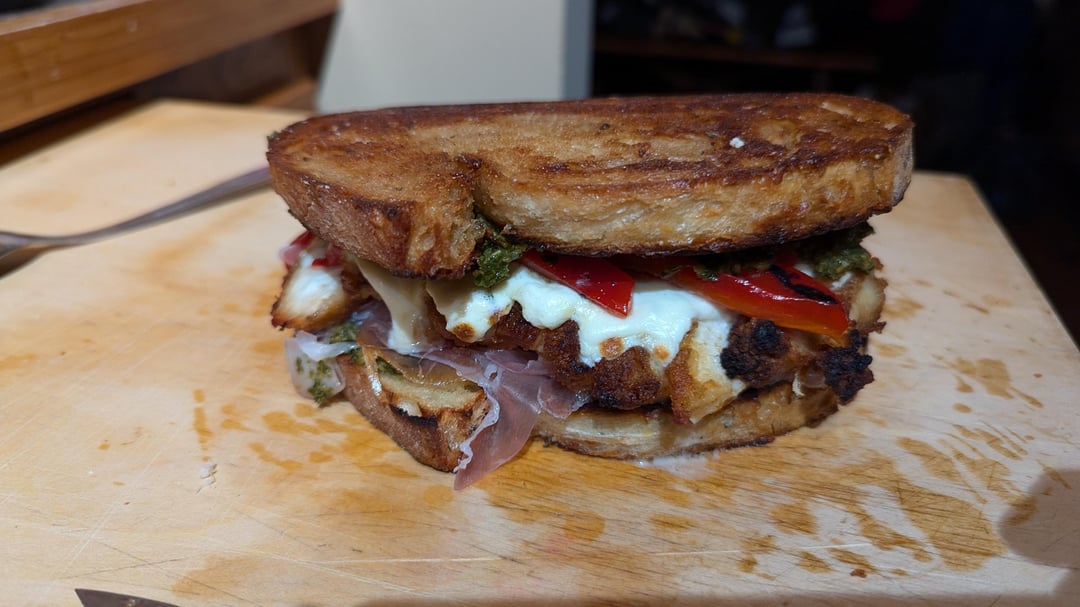 Bottom to top we have Resomary Parm bread fried in butter, pesto, prosciutto, breaded chicken breast topped with burrata and broiled, roasted red pepper, more pesto, and another butter-fried piece of bread